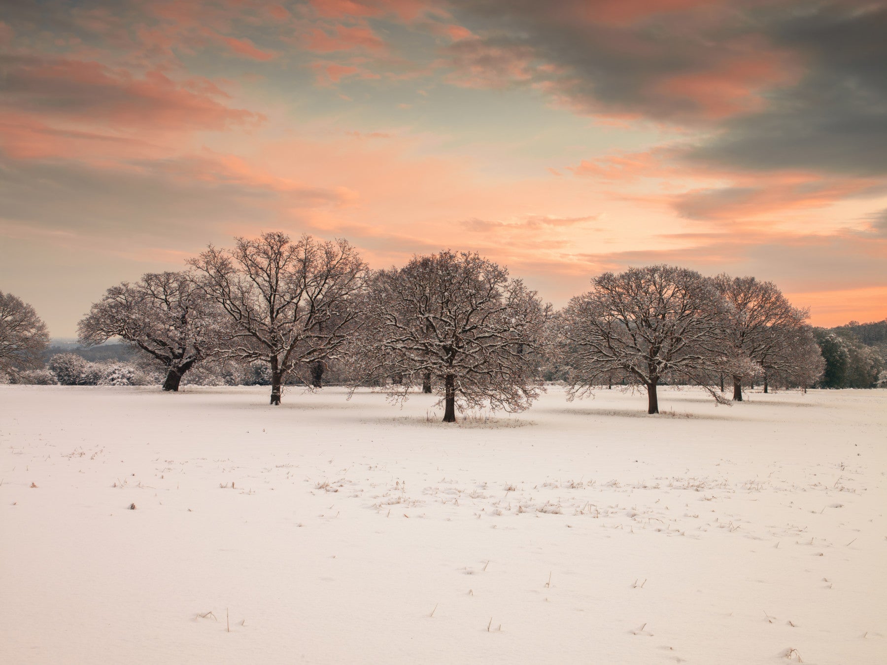 Trees in a snow covered field at dawn. Immerse yourself in the serene beauty of a 'Snow Covered Field' with this breathtaking wallpaper. Captured at twilight, a vast expanse of pristine white snow stretches to the horizon, punctuated by a scattering of trees, their branches laden with delicate snow. The sky, a canvas of soft pink and grey hues, adds a touch of warmth and serenity to the cold landscape. The gentle light creates a tranquil and peaceful atmosphere, perfect for creating a calming ambience on your screen. The crispness of the air and the stillness of the scene are almost palpable, offering a moment of respite and a connection to the quiet beauty of winter. This wallpaper is an ideal choice for those seeking a minimalist yet captivating scene, bringing the calming essence of a snow-covered field into your digital space.