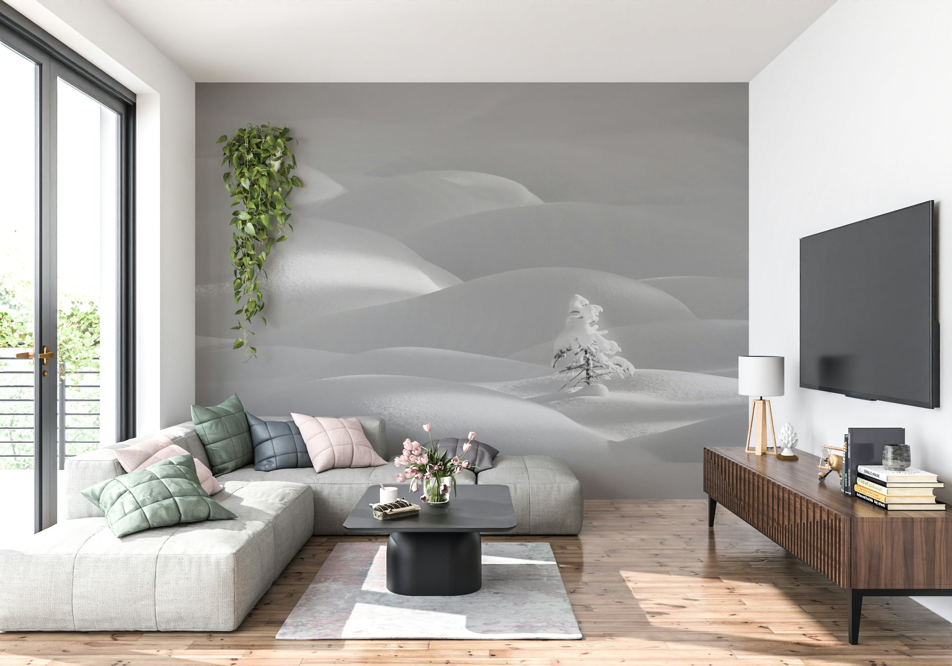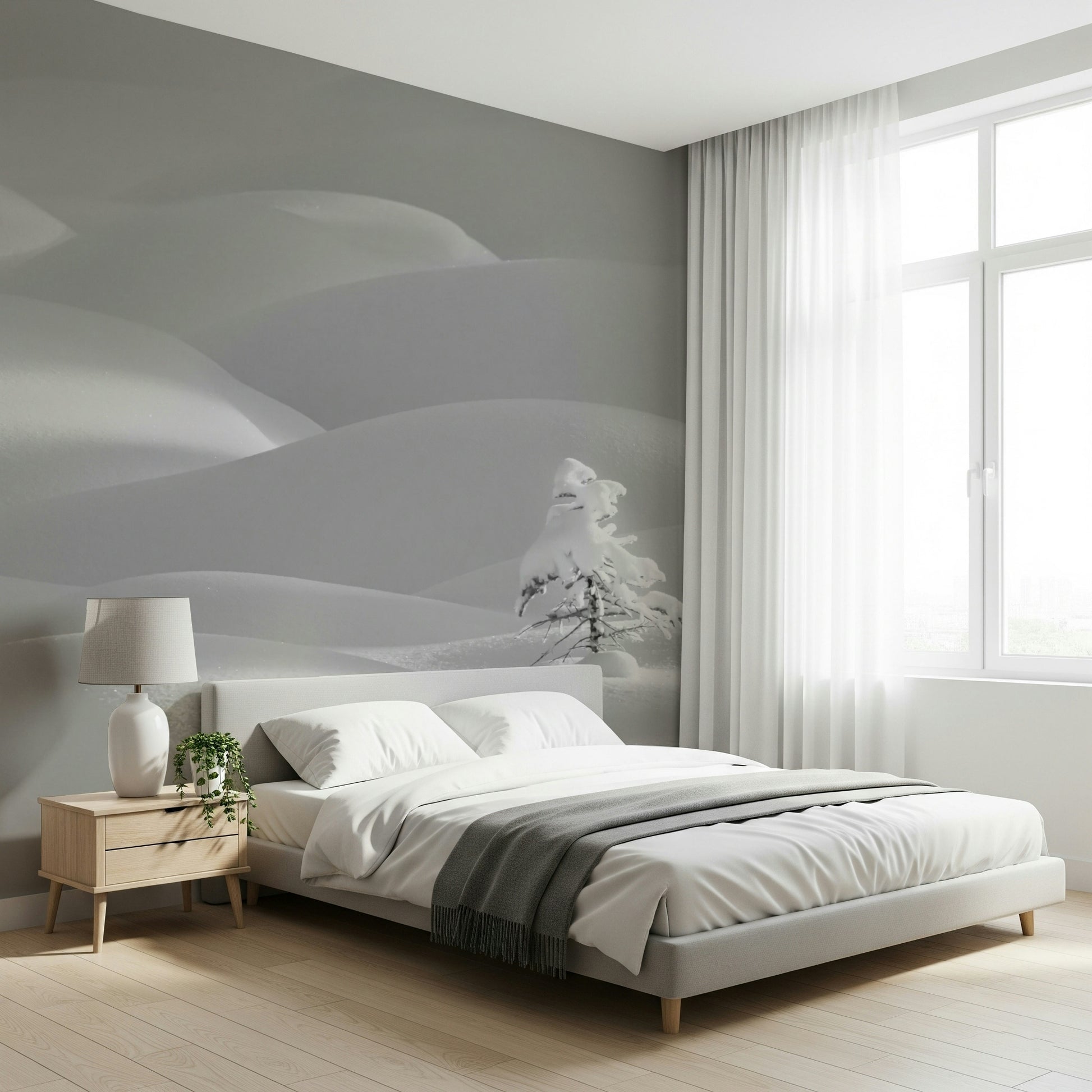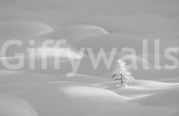 Bring the quiet beauty of winter into your home with this tranquil snowscape. Soft, rolling snow drifts form a peaceful landscape, punctuated by a single snow-laden tree. This image inspires relaxation and is suitable for a bedroom or living area. As wallpaper for walls, it creates a serene backdrop. Its monochrome palette blends easily with any decor, particularly modern or minimalist. Imagine the calming effect in a study or meditation space. Add a touch of winter magic.