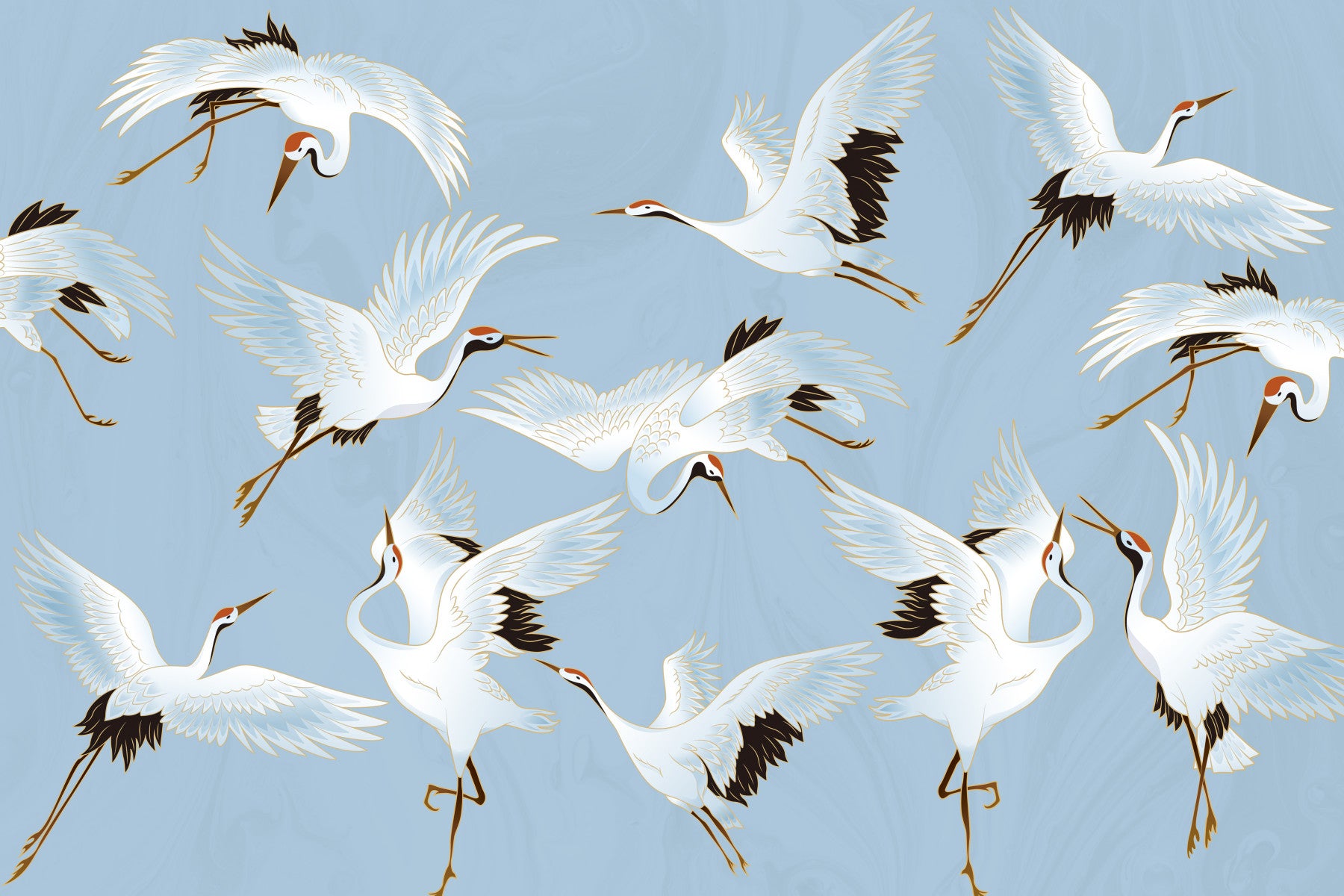 Graceful cranes take flight across a serene blue backdrop. This wallpaper features delicate linework with touches of black and gold that adds a refined beauty. The pattern creates a peaceful and elegant mood. Use this wallpaper for walls to