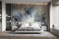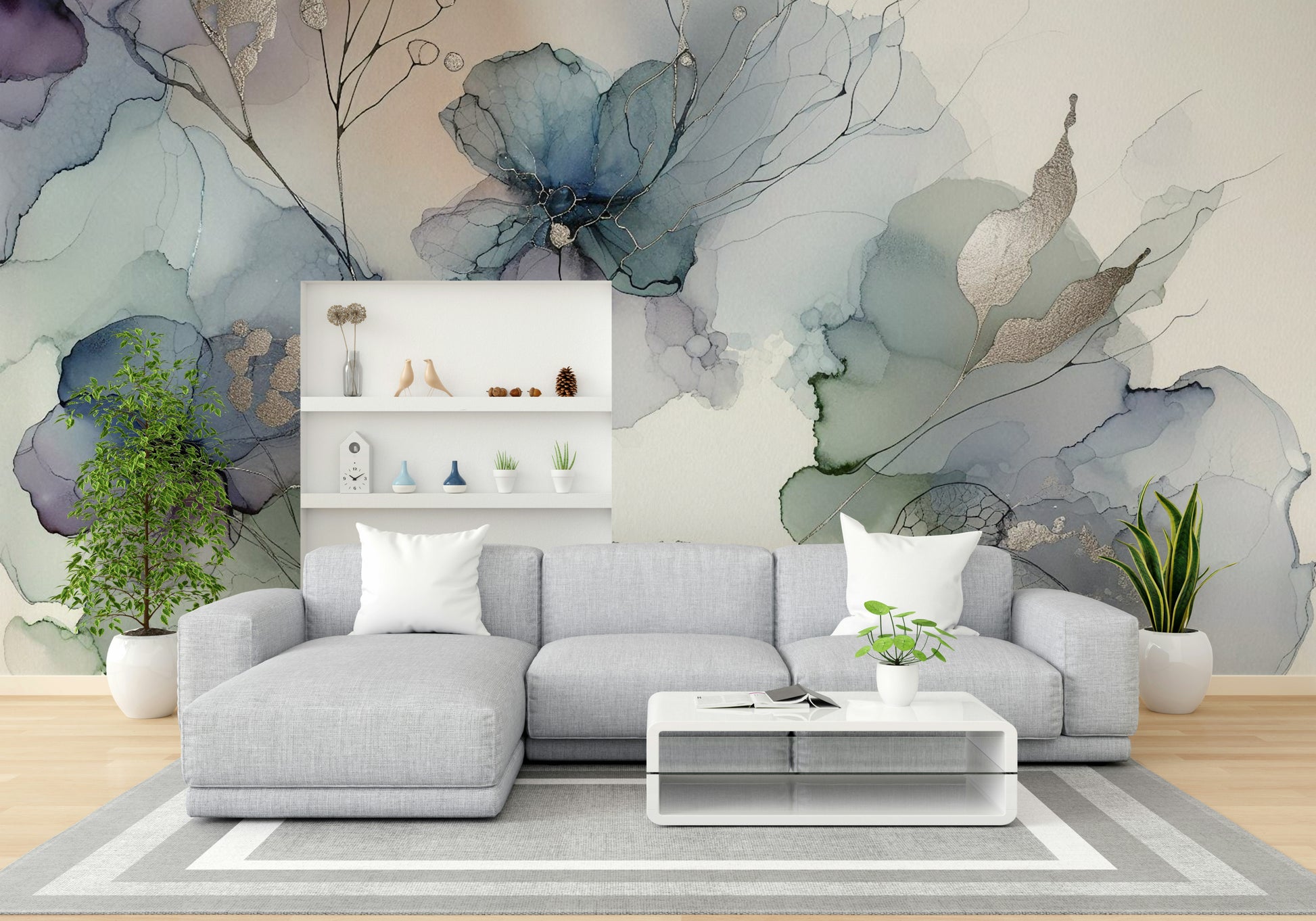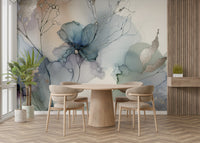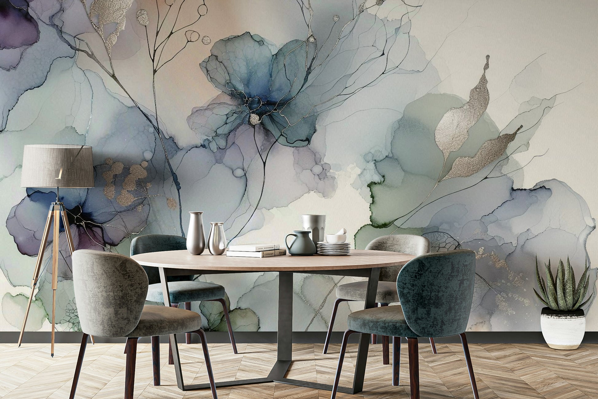This ethereal wallpaper captures the beauty of abstract floral art. Delicate watercolor blooms in shades of blue, grey, and green are accented with elegant silver leaf detailing. The soft color palette and flowing forms create a sense of tranquility and calm, making it ideal for bedrooms, living rooms, or any space needing a touch of serene sophistication. The blend of organic and metallic elements adds a touch of modern elegance, while the overall mood evokes a sense of peaceful contemplation and natural beauty.