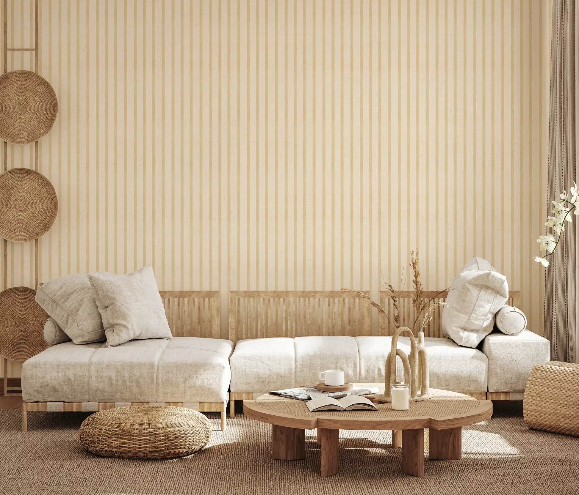 Transform your home into a haven of gentle sophistication with our "Soft Candy Stripes On Canvas" wallpaper. This exquisite design captures the comforting essence of a hand-painted canvas, adorned with perfectly aligned, subtle vertical stripes. The palette features a delightful interplay of creamy vanilla and warm, muted caramel tones, reminiscent of your favourite comforting treats. Each stripe possesses a delicate, almost woven texture, adding an inviting depth and tactile quality to your walls. This pattern is not just a visual treat; it's an experience, creating an atmosphere of serene elegance and quiet charm. Ideal for crafting a peaceful bedroom retreat, a welcoming living area, or a soft, inspiring nursery. The timeless simplicity and understated grace of these candy-like stripes on a canvas backdrop offer a versatile foundation for any interior design, ensuring your home feels effortlessly chic and wonderfully cosy.