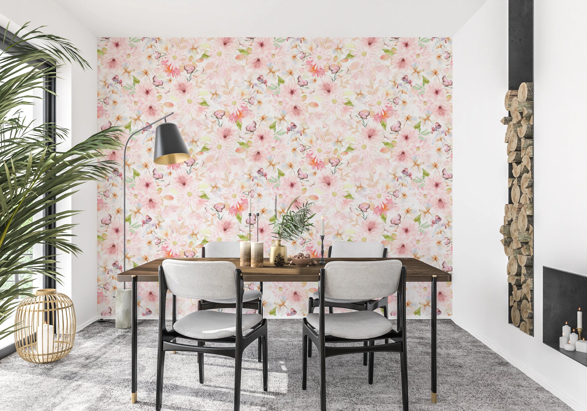 Transform your walls into a canvas of delicate artistry with our Soft Floral Wash wallpaper for walls. The design features painterly blooms in a watercolour style, showcasing soft pinks, gentle greens, and creamy off-whites that merge with light beige tones. Ideal for bedrooms, nurseries, or reading nooks, the wallpaper creates a calm, inviting atmosphere with subtle pops of colour. Its seamless pattern offers a sophisticated, organic texture that works particularly well with natural light. Soft Floral Wash brings a hint of spring into your home, harmonising beautifully with both modern and vintage furniture.