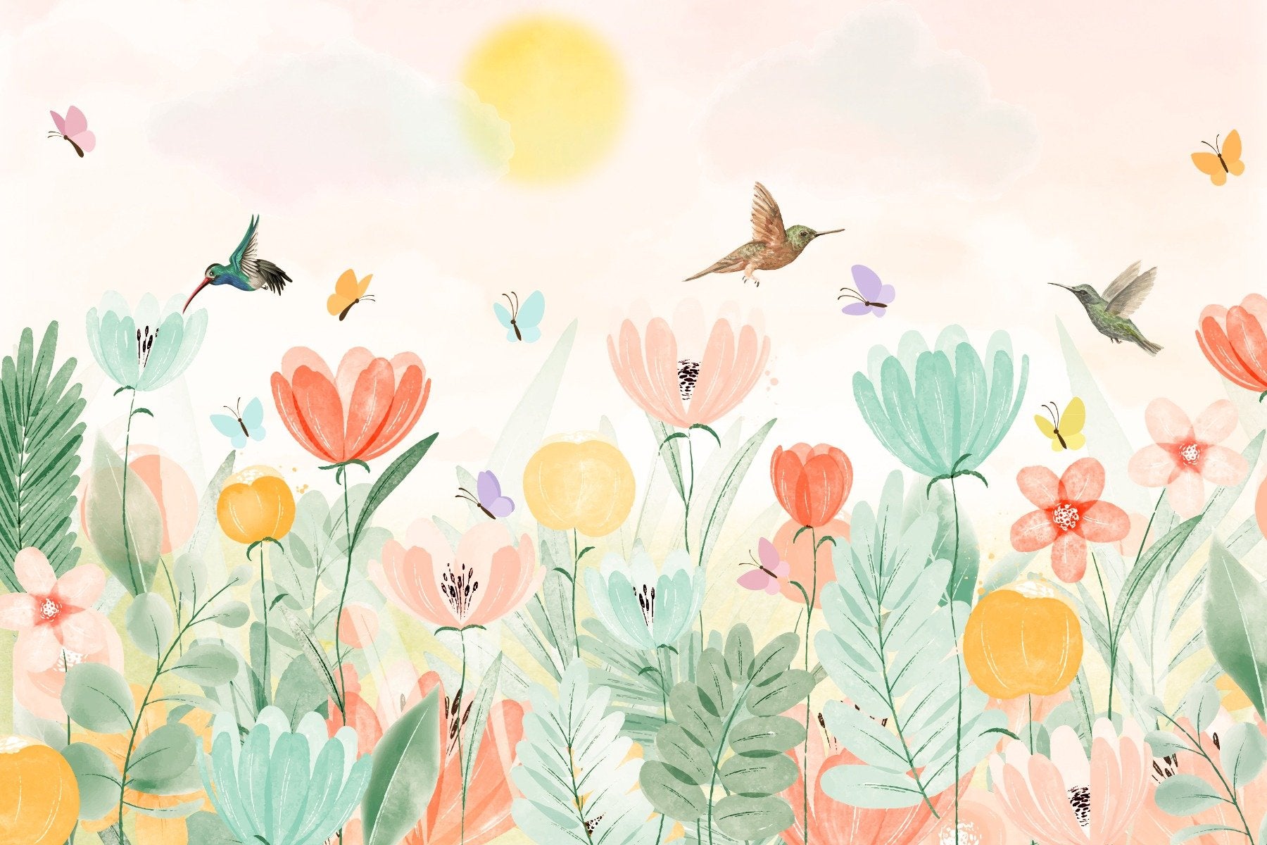 Elevate any room with the soft pastel spring garden mural, a harmonious blend of watercolor florals and spirited birds in flight. This enchanting flower wallpaper merges delicate hues and gentle brush strokes, creating a peaceful retreat right on your wall. As a birds wallpaper, it showcases the whimsical dance of hummingbirds amongst blooms, infusing your home with the freshness of a spring morning. Ideal for those who wish to bring the subtle charm of nature indoors, this spring flower wallpaper mural is a celebration of new beginnings and the simple joy that flowers and fauna can bring to everyday life. Perfect for living spaces or a child's room, it's an artful escape into a world of soft pastels and serene beauty.