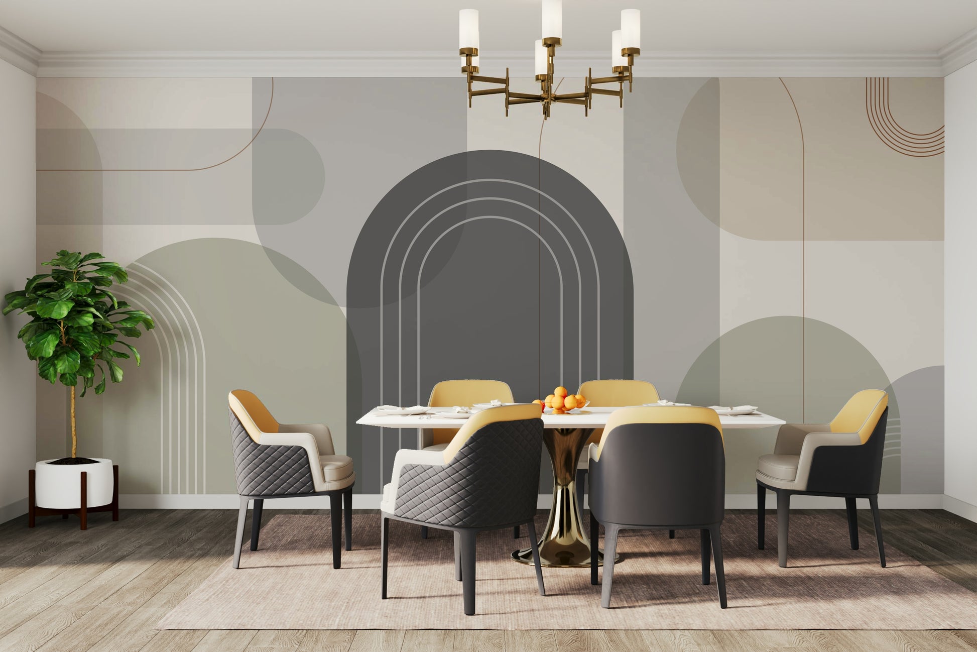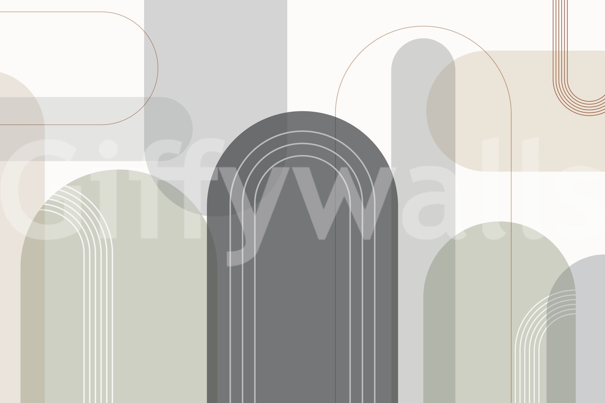 Embrace tranquility with "Sophisticated Arches Warm," a minimalist wallpaper featuring a harmonious blend of soft muted greens, greys, and beige. Overlapping rounded rectangles and arches create a sense of depth and visual rhythm. Subtle linework adds a touch of elegance, enhancing the overall calming effect. This design evokes a peaceful atmosphere, perfect for creating a serene and stylish backdrop in your space. The interplay of shapes and colors promotes a sense of balance and quiet sophistication, making it ideal for those seeking a visually understated yet impactful aesthetic.