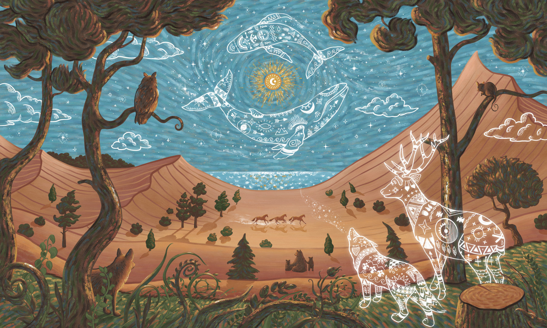 Symbolic animal wall mural with decorative line art and night setting
