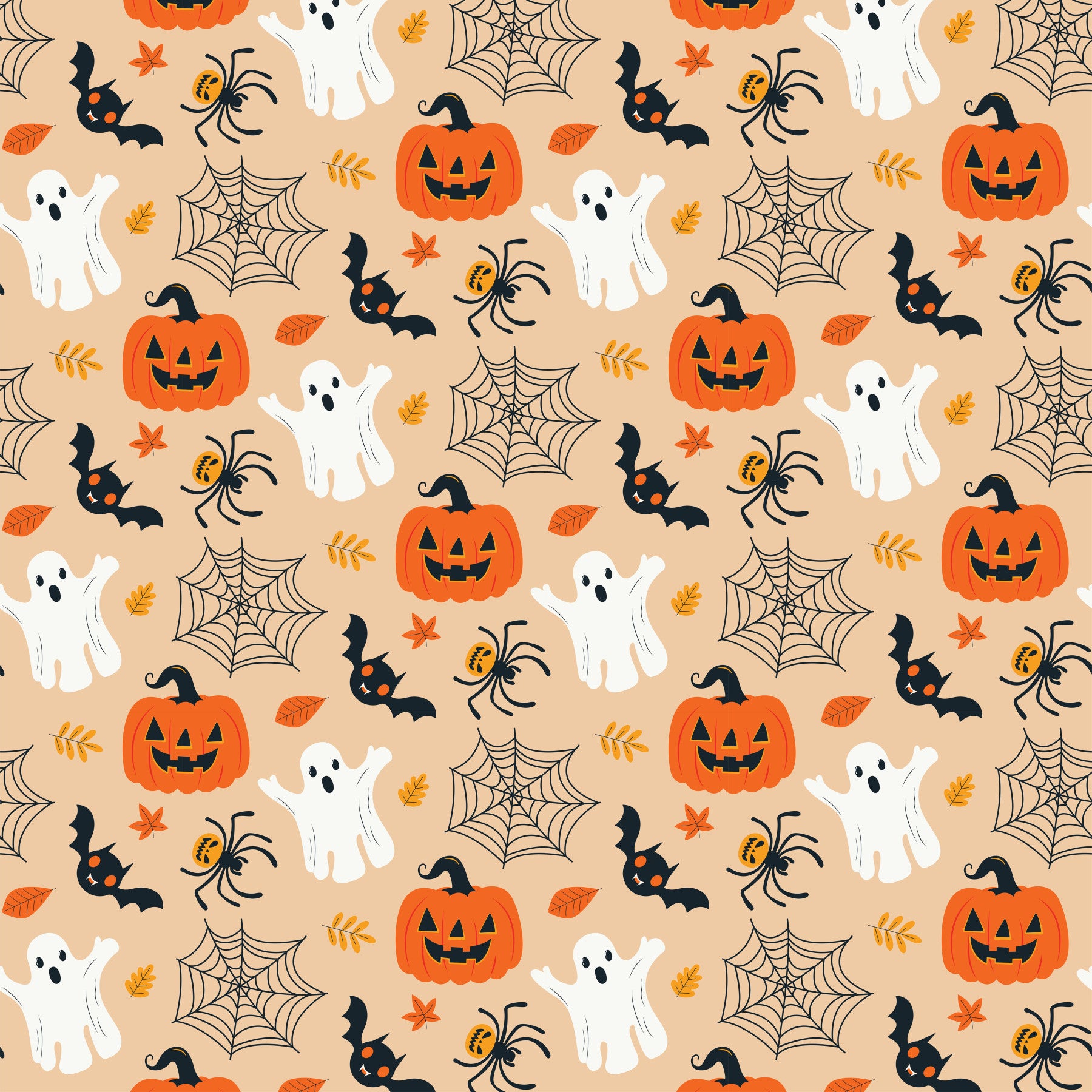 Invite a bit of Halloween charm into your home with this delightful wallpaper for walls. Ghosts, spiders, bats and pumpkins create a joyful pattern, perfect for a kids' room. The warm beige background with orange and black accents makes it an easy match for many interior styles. Make any space a little more fun with this lively Halloween design. Add this cute wallpaper to your living room, nursery or playroom walls.