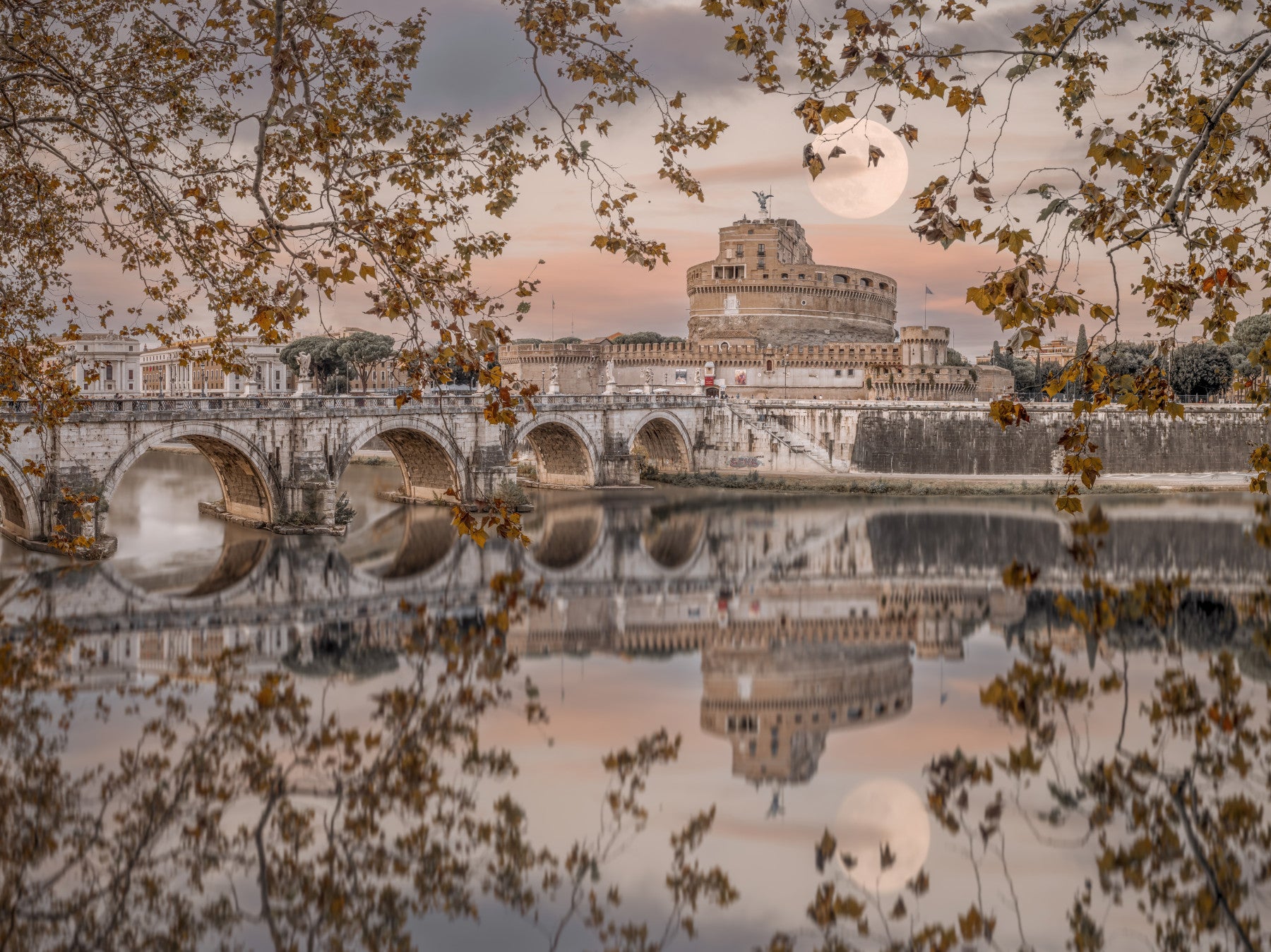 The St Angelo Castle Wall Mural gives your home a feeling of peaceful, historical beauty. This mural wallpaper shows a beautiful photograph of St Angelo Castle and the bridge over the Tiber River at sunset. The calm water reflects the castle and a large moon, while autumn branches frame the scene. This is a simple way to get a unique and elegant look for any room. This high-quality wallpaper for walls is ideal for a living room, dining area, or bedroom.