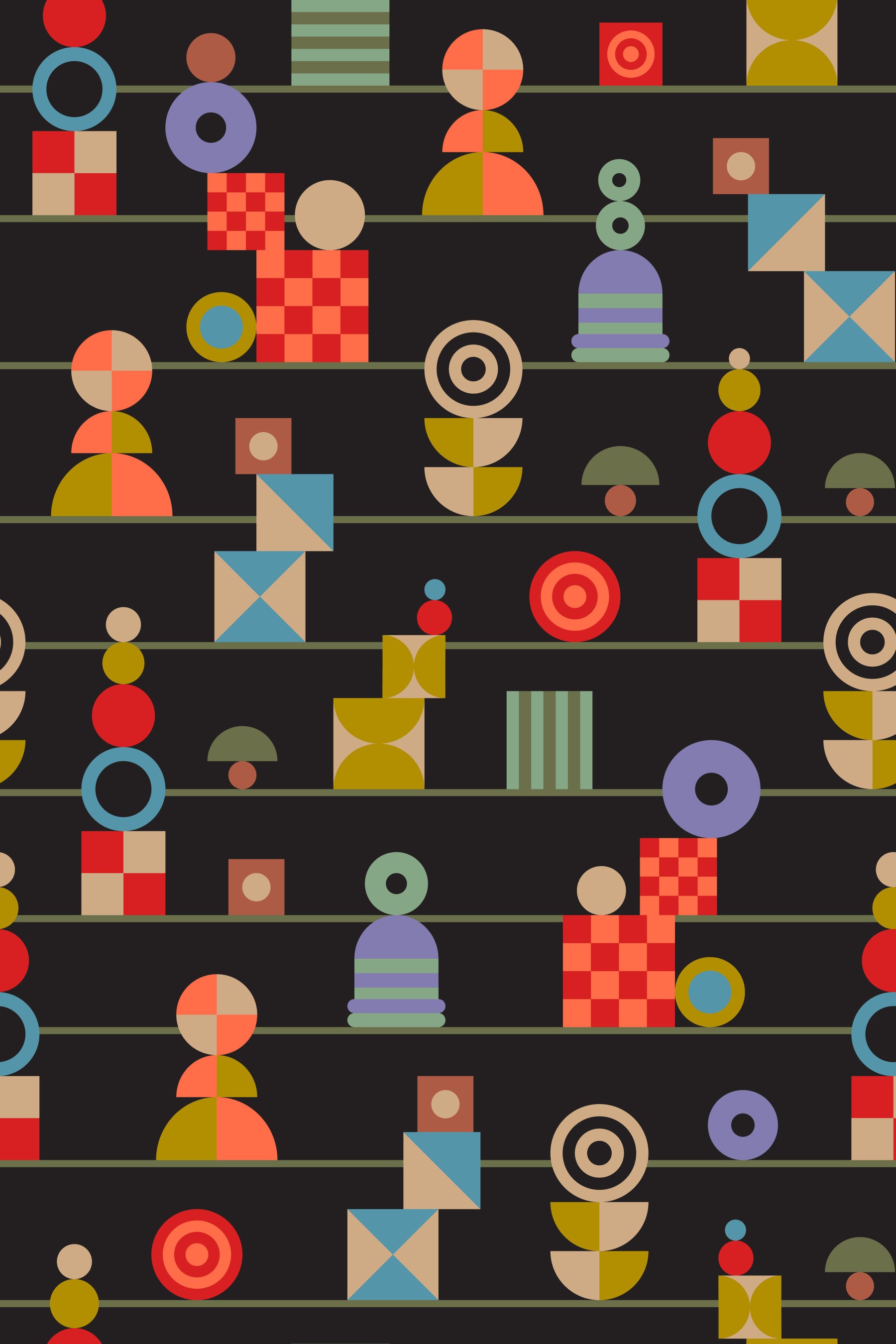Stacked retro shapes arranged in striped rows, adding bold color contrast to a charcoal wallpaper design.