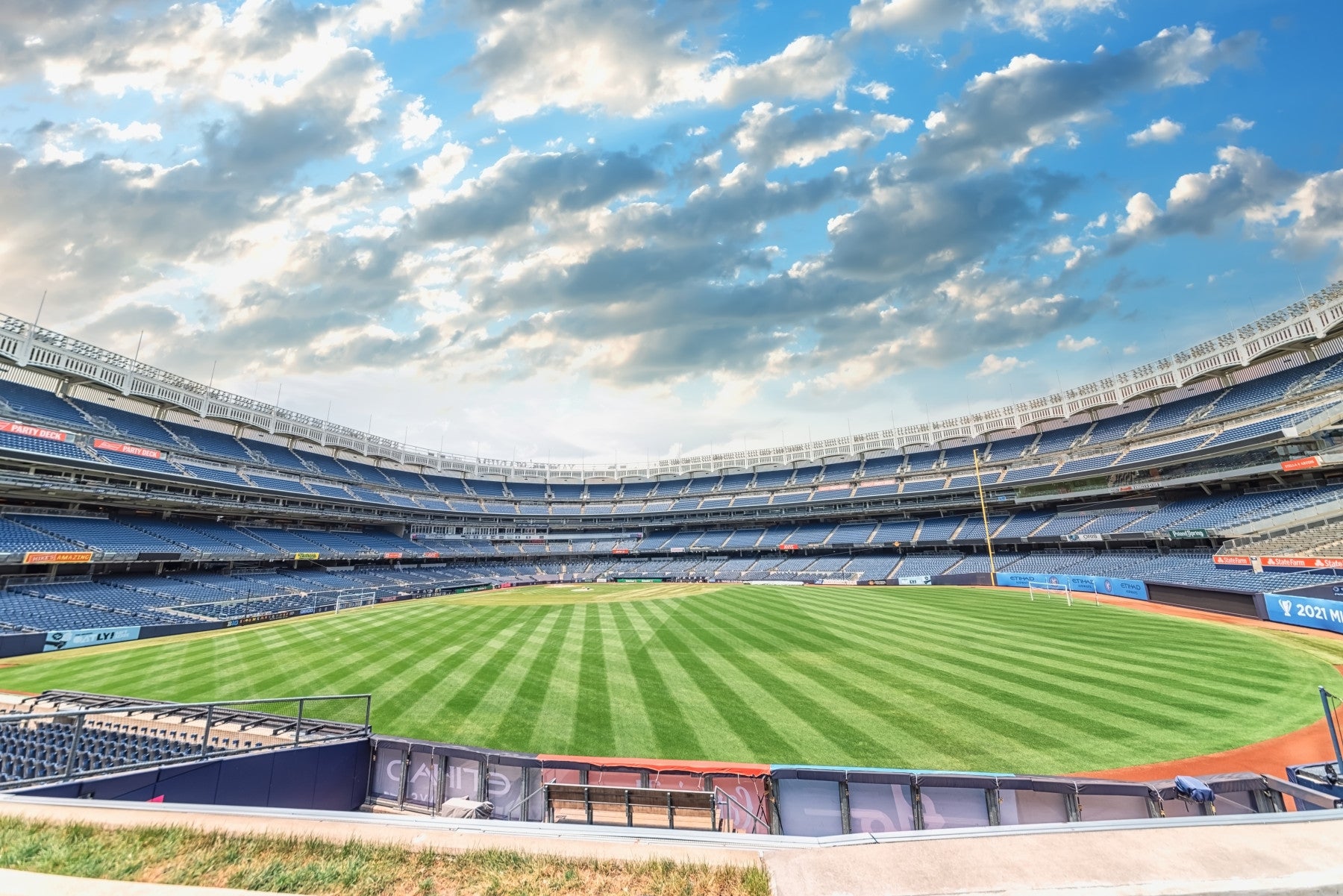 Bring the energy of a stadium atmosphere into your living space with this dynamic wallpaper for walls. The image features a vibrant green playing pitch under a bright blue, cloud-filled sky, creating a sense of openness. The stadium's architecture adds depth and a touch of urban sophistication. This design works perfectly in a games room, bedroom or office. The green and blue colour scheme brings a calming effect, making it ideal for creating an inviting and active atmosphere. This wallpaper enhances any space with a blend of nature and architectural drama.