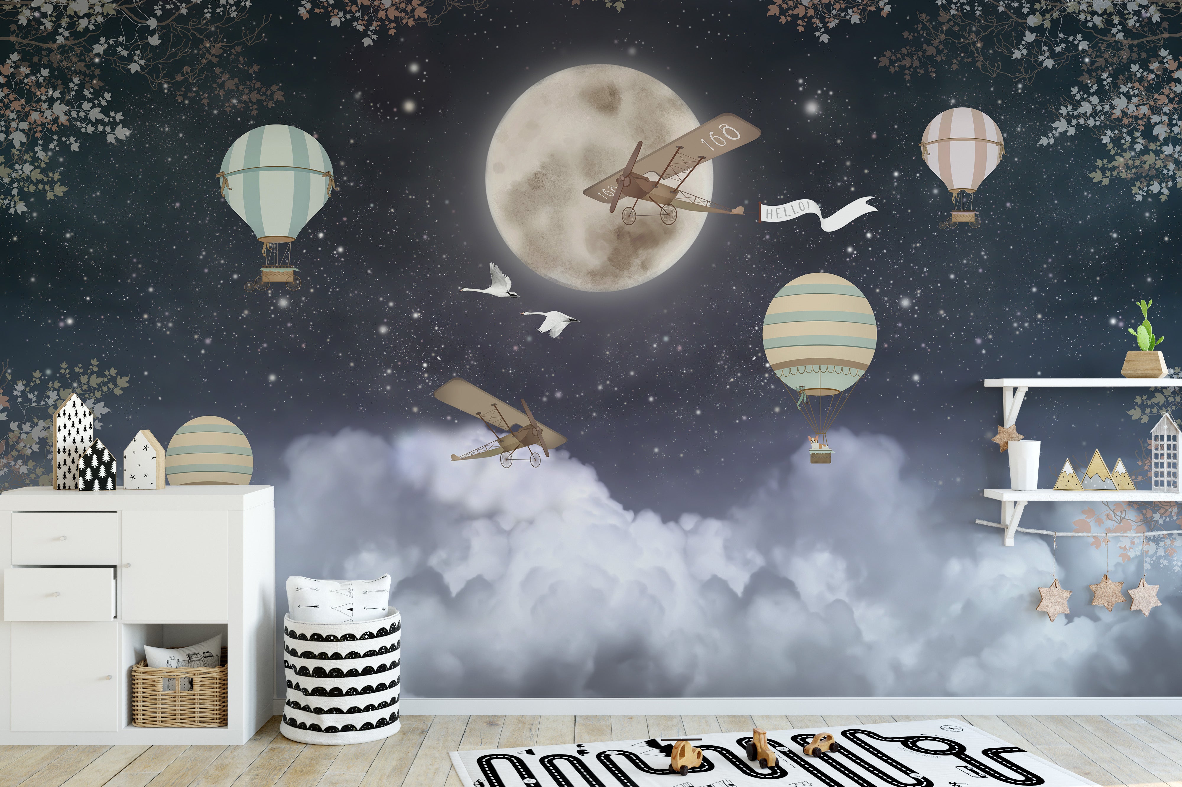 Imagining a serene and peaceful atmosphere for your child's room? You can't go wrong with dreamy, star-studded night clouds as the backdrop of their dreams. While it's crucial to provide children with a comfortable and functional space to sleep, it's equally important to create a magical realm that will make them excited to come back to their room at the end of each day. A mural wallpaper featuring starry night sky and fluffy clouds will transport your child to a world of wonder deserving of their youthful imagination. Complete with accessories such as glow-in-the-dark stars and soft lighting, this setup will be almost as breathtaking as the view from a starship window.