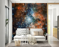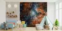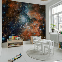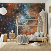 Elevate your interior design with 'Starlight Vista' wallpaper for walls, capturing the awe-inspiring beauty of a distant galaxy. This design bursts with vivid colours and intense luminosity, offering a stunning visual impact. The cosmic dust clouds in shades of blue and burnt orange create an ethereal feel. This pattern brings a dramatic, artistic flair to bedrooms, studies, and hallways. Install it as a feature wall to create a unique focal point. It evokes a sense of infinite wonder and adds a touch of otherworldly elegance to your home.