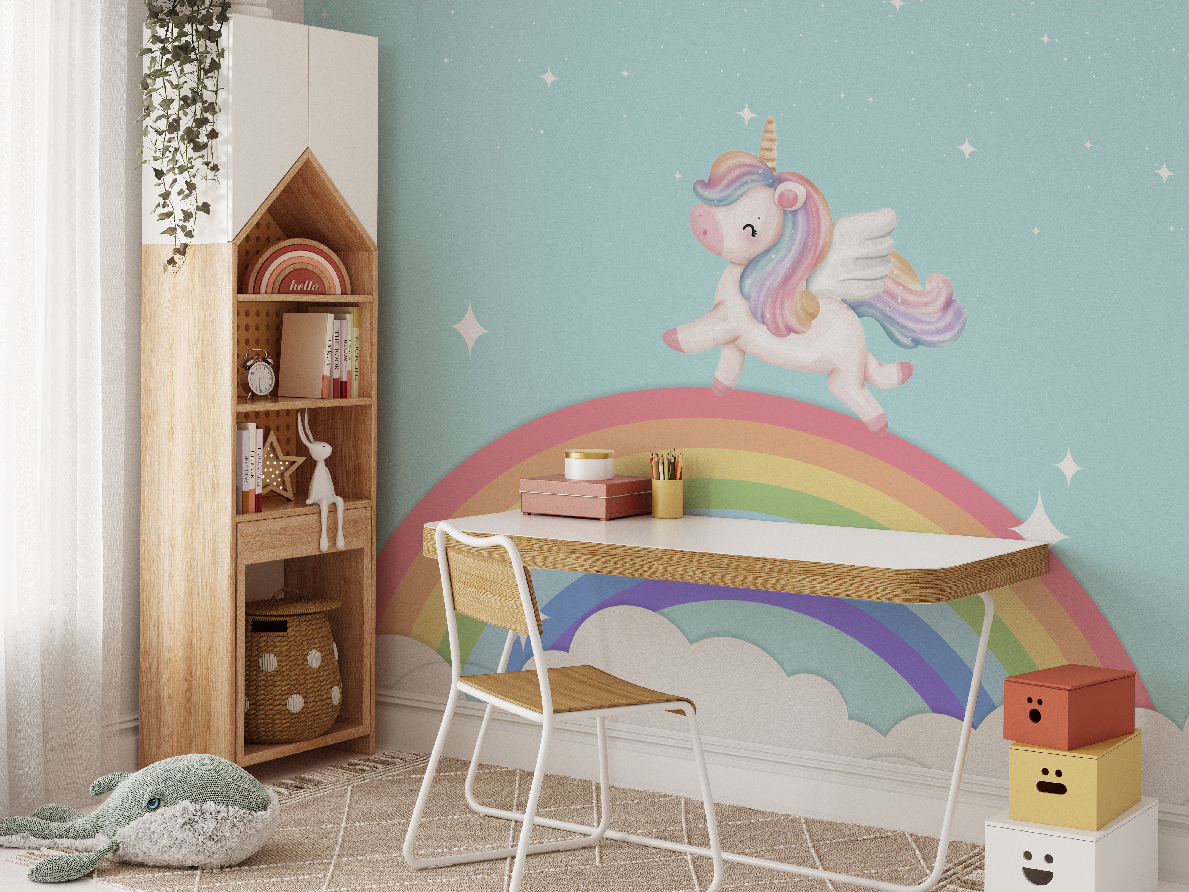Rainbow unicorn mural wallpaper creating a fantasy world.