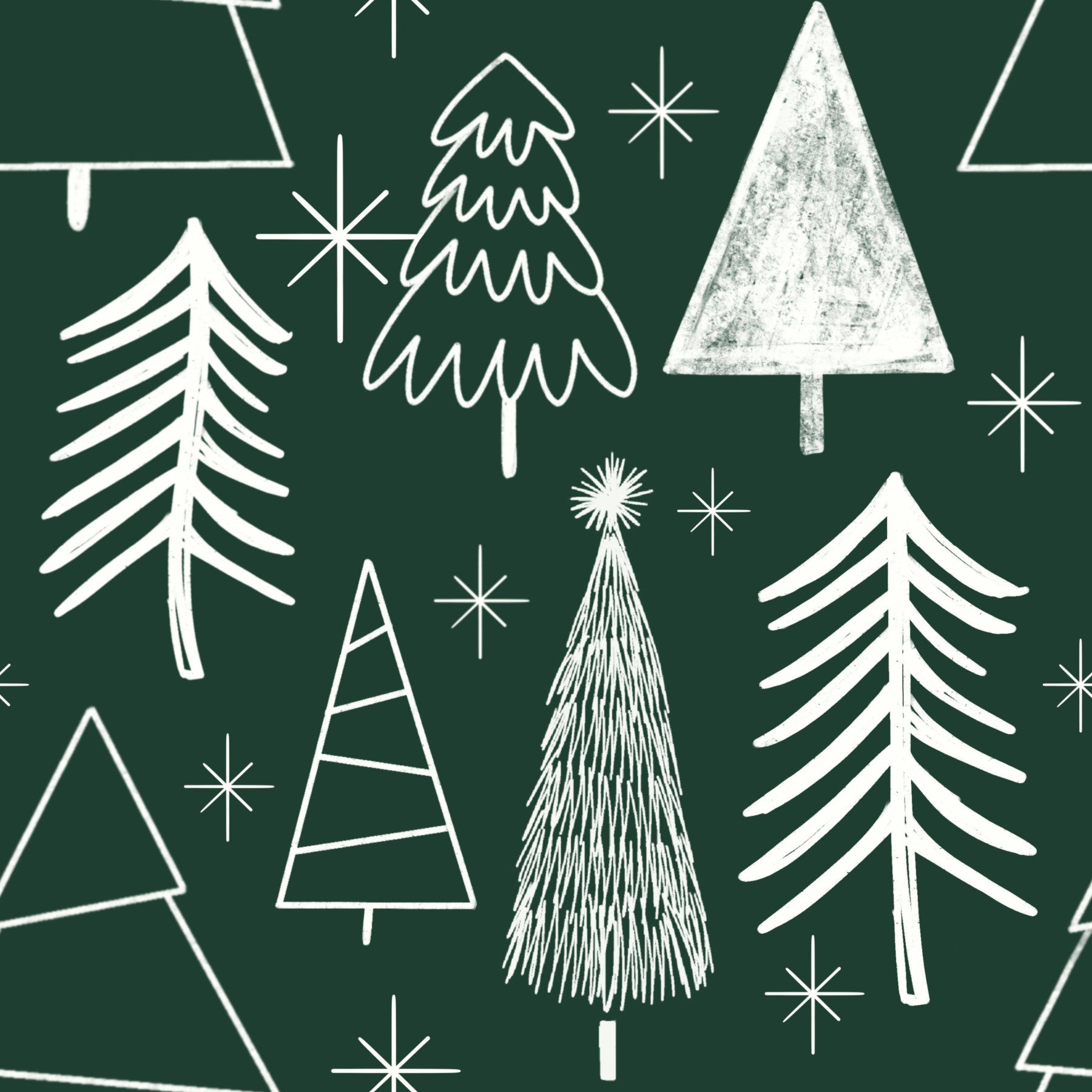 A dark green holiday wallpaper decorated with white illustrated evergreens and twinkling stars.