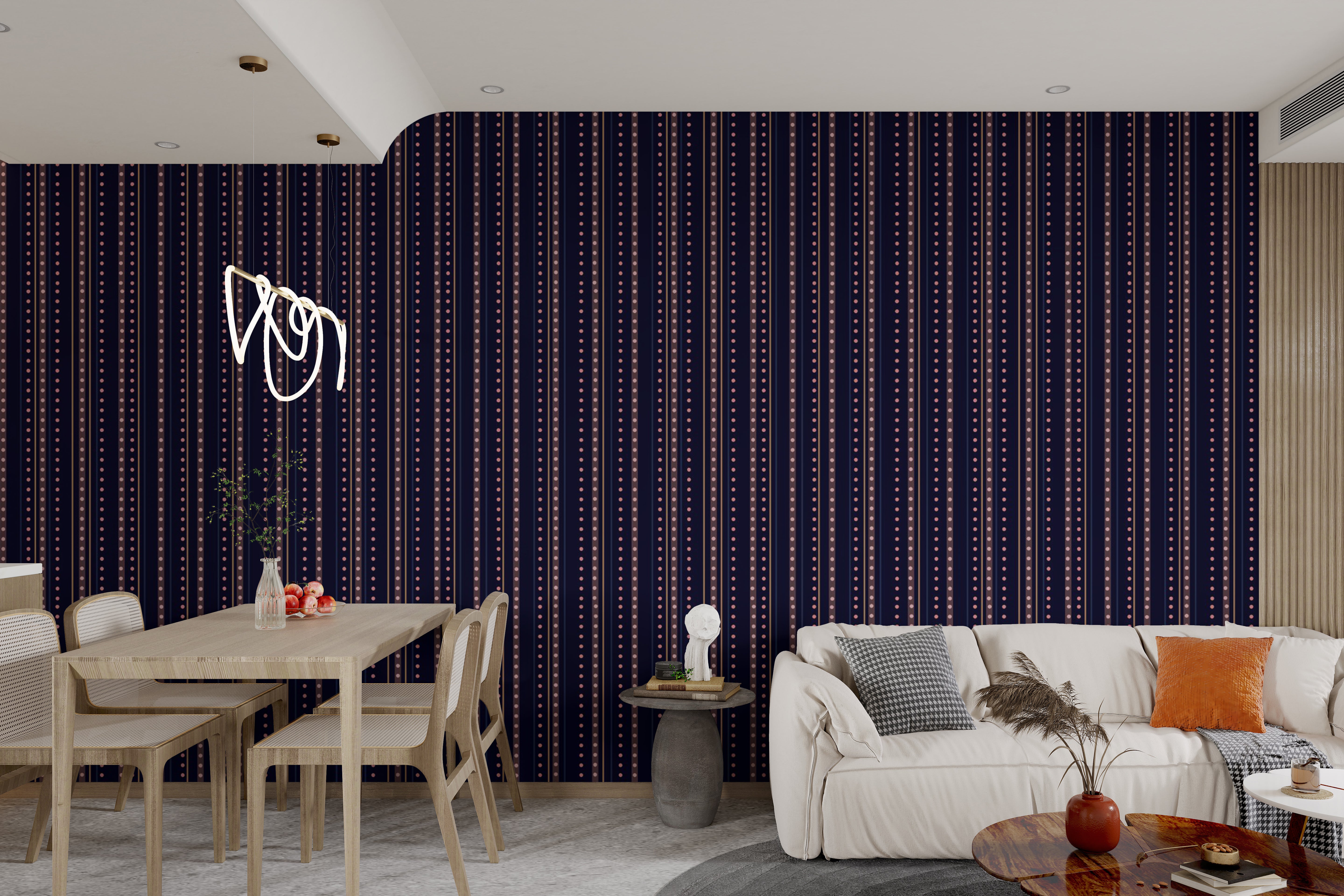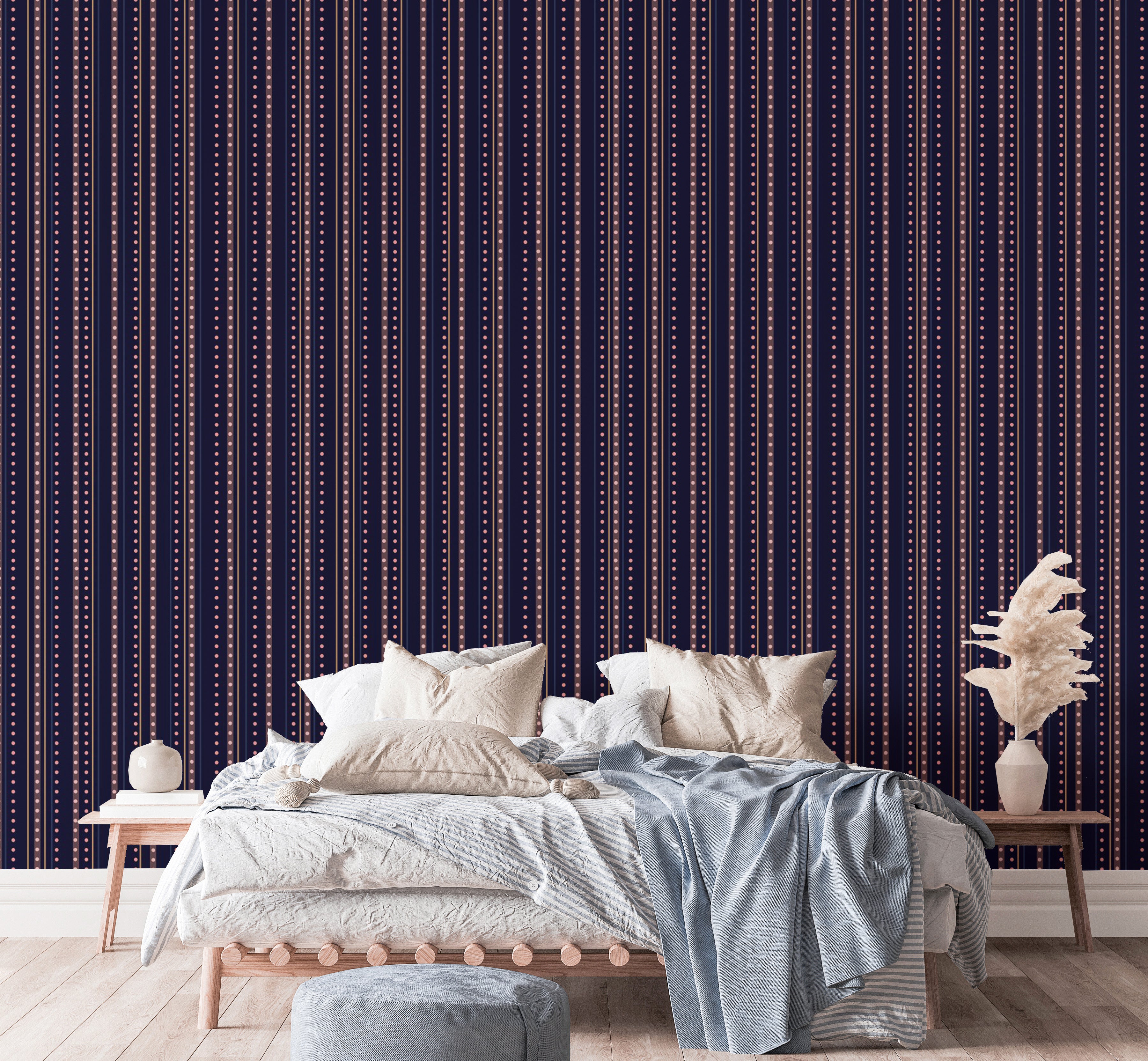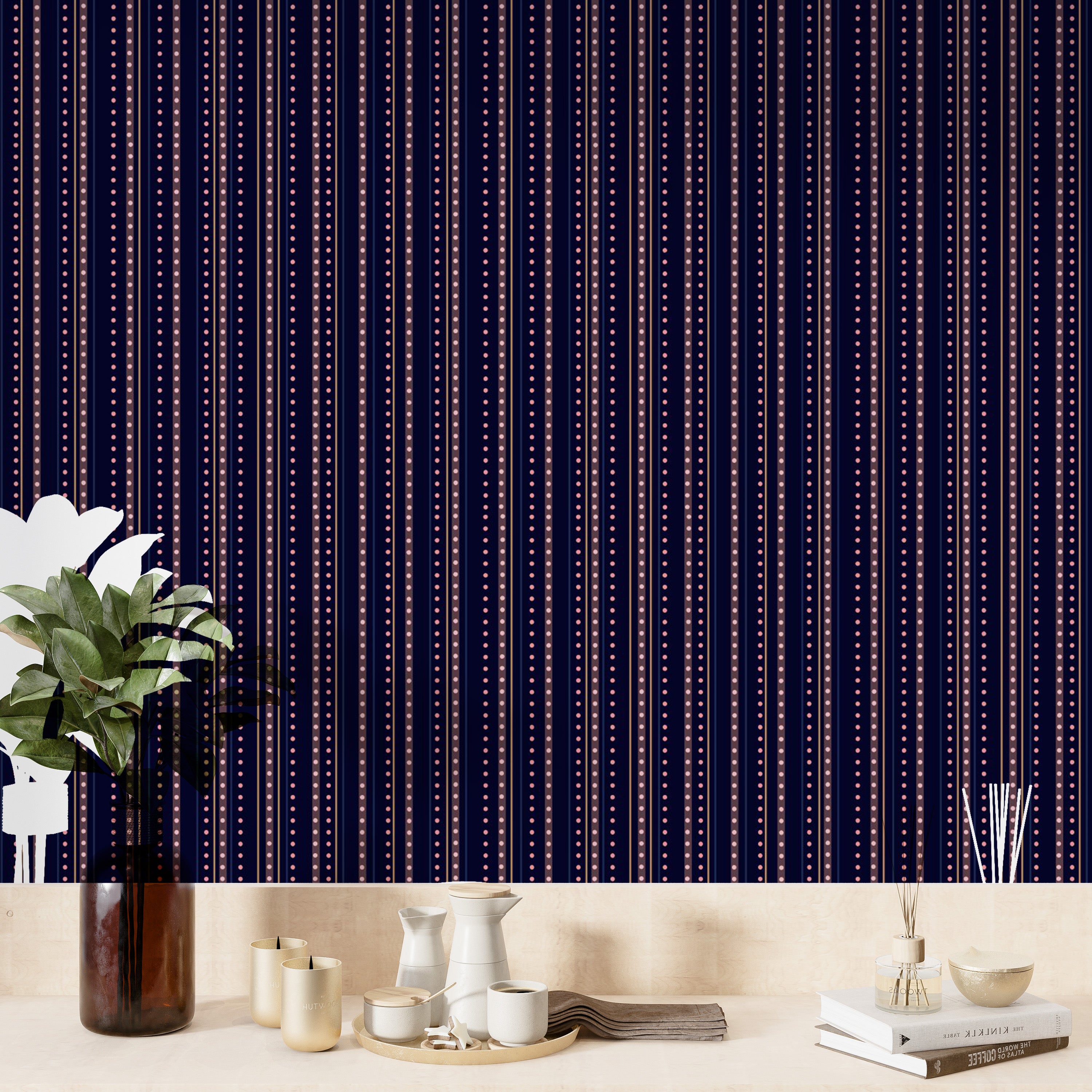Bask in the nocturnal magic of the Starry Indigo Waltz Wallpaper, where the rhythmic pattern of stripe wallpaper meets the enchanting quietude of a starlit sky. Adorning your walls with this celestial tapestry promises a lyrical fusion of art and imagination. Each line a delicate whisper of indigo, punctuated by twinkles that mimic distant galaxies. This design doesn't just adorn a wall it narrates an everlasting romance between night's deepest charm and day's bright promise, ensuring that every glance ignites creativity and wonder, akin to gazing upon the endless dance of the cosmos itself.