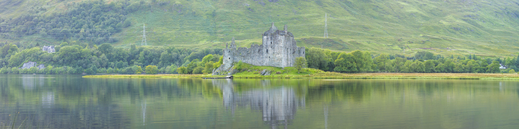 Kilchurn Castle, Loch Awe, Scotland. Evoke a sense of calm with this wallpaper for walls. This landscape showcases a historic castle and a still loch. The colour scheme centres around natural greens, muted greys, and earthy browns, promoting a sense of peace. This design brings nature indoors, making it suitable for a bedroom, living room, or study. Experience the quiet strength of this scene as it complements interiors and changes your rooms into relaxing spaces with historic charm.