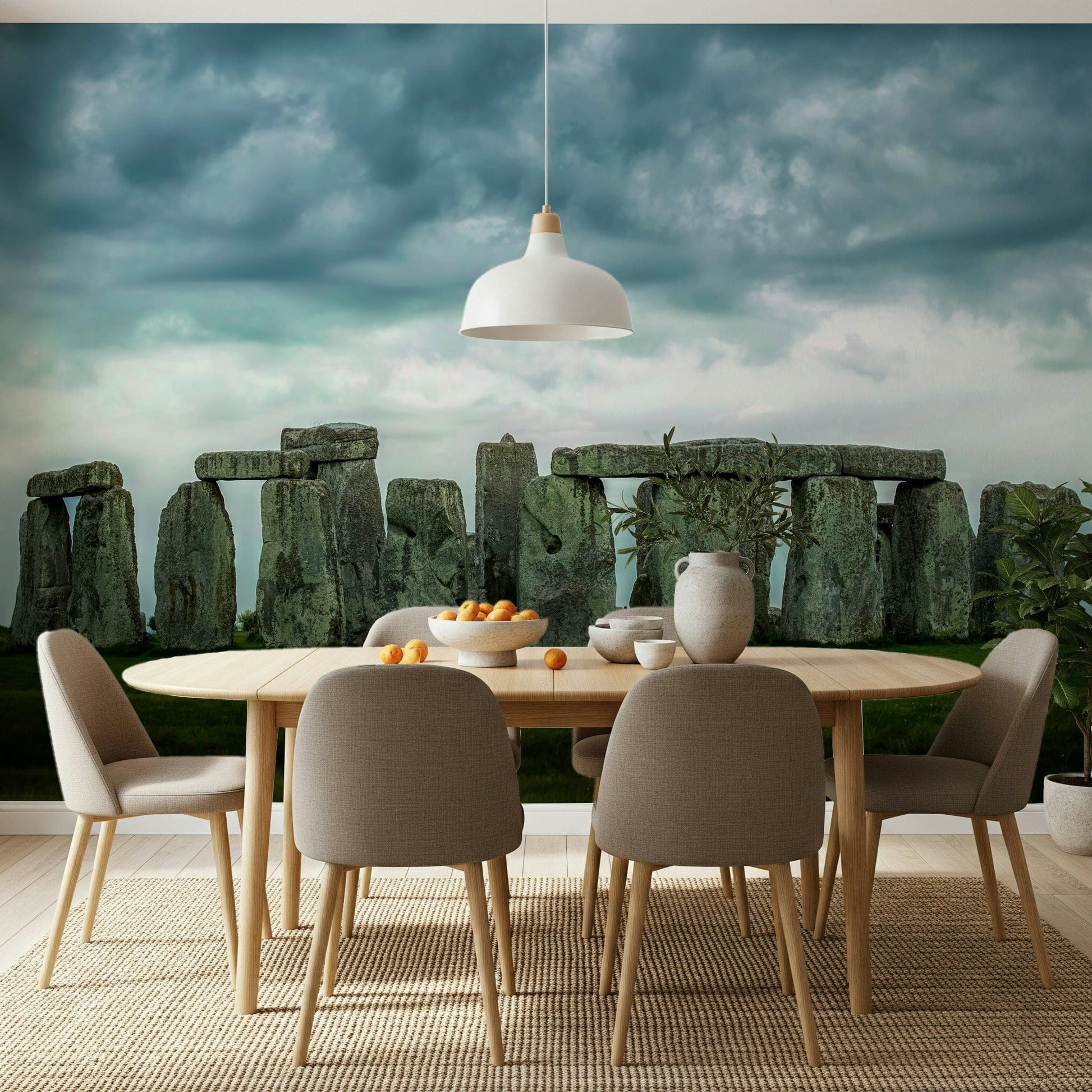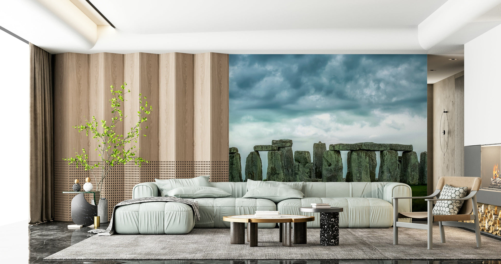 Embrace history with this captivating Stonehenge wallpaper for walls. The image showcases the iconic stone circle under a dramatic sky, creating a sense of ancient mystery. Its neutral tones of grey and green blend easily with various interior styles, from modern to rustic. Consider this for a study, living room, or hallway. The design adds a focal point that sparks conversation and infuses the space with a sense of wonder and timelessness.