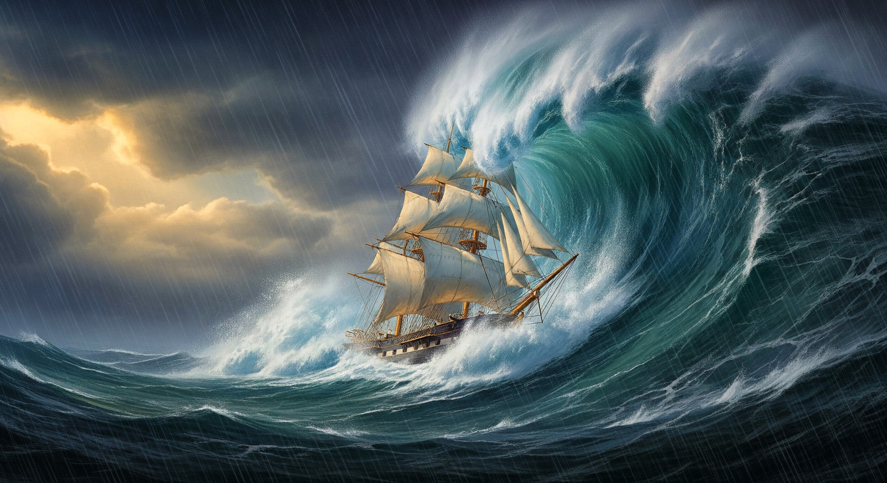 The Storm's Fury wall mural depicts a dramatic maritime scene that captures the intensity of the open sea. This artwork showcases a classic wooden ship navigating through a colossal, surging wave amidst a turbulent storm. The high-contrast lighting and rich details of the water spray and heavy clouds create a feeling of authentic nautical adventure. Perfect for those who appreciate the raw power of nature, this piece brings a bold focal point to any interior. The Storm's Fury wall mural is printed with precision, ensuring every element of the ship and the crashing water remains sharp and clear for a striking, immersive aesthetic.