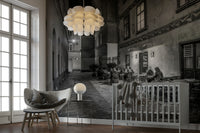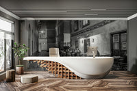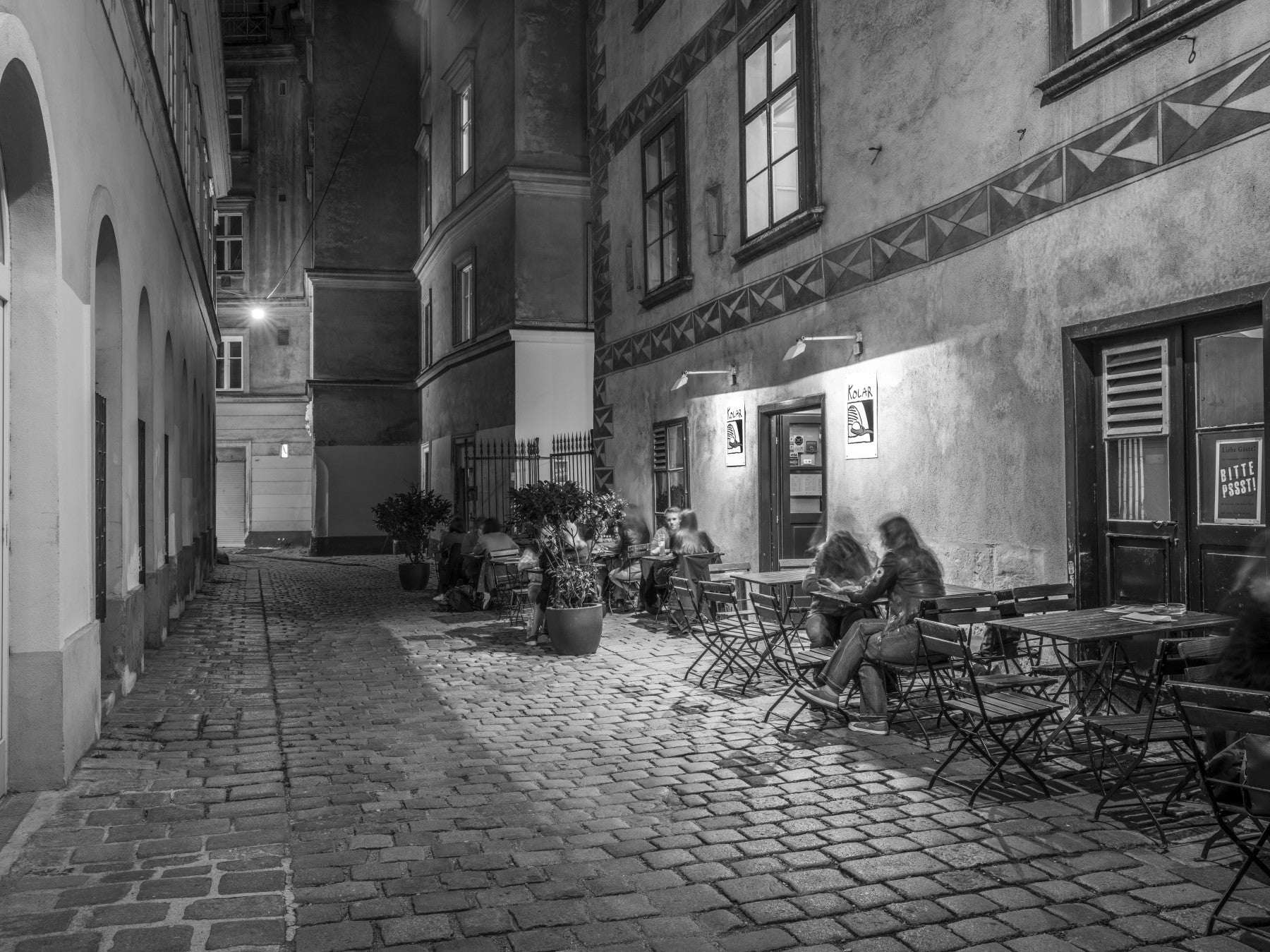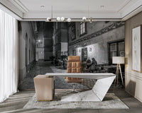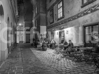 The Street cafe in Vienna Wall Mural captures a charming, monochrome scene of a historic alleyway at night. Patrons sit at outdoor tables on a narrow cobblestone street, enjoying the atmospheric glow of artificial light from the local establishment. Detailed masonry and architectural patterns on the surrounding buildings add a timeless sense of character. This urban landscape design provides an inviting and nostalgic focal point for any modern home interior.