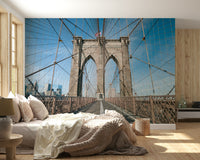 Pedestrian walkway on Brooklyn Bridge, New York. Immerse yourself in the urban serenity with "Strolling Across the Brooklyn Bridge," a stunning vista capturing the iconic landmark. Feel the gentle breeze as you mentally traverse its historic walkway, the intricate web of cables stretching towards the brilliant azure sky above. The majestic stone towers stand proud, adorned with the American flag, emblems of strength and resilience. Below, the suggestion of the cityscape offers a subtle reminder of the vibrant life surrounding this tranquil haven. This image evokes a sense of peace and wonder, inviting you to bring the grandeur and timeless elegance of New York City's architectural marvel into your personal space. Transform any room into an inspiring sanctuary with this captivating portrayal of one of the world's most beloved bridges.
