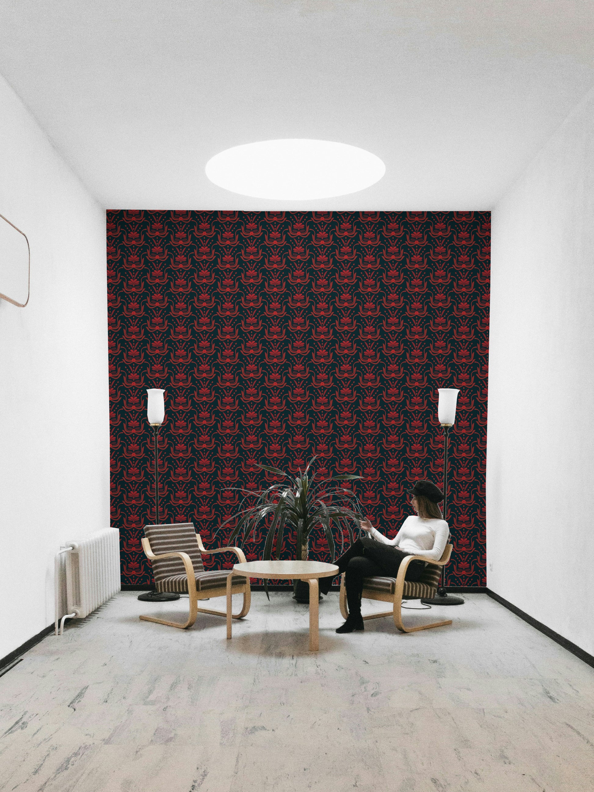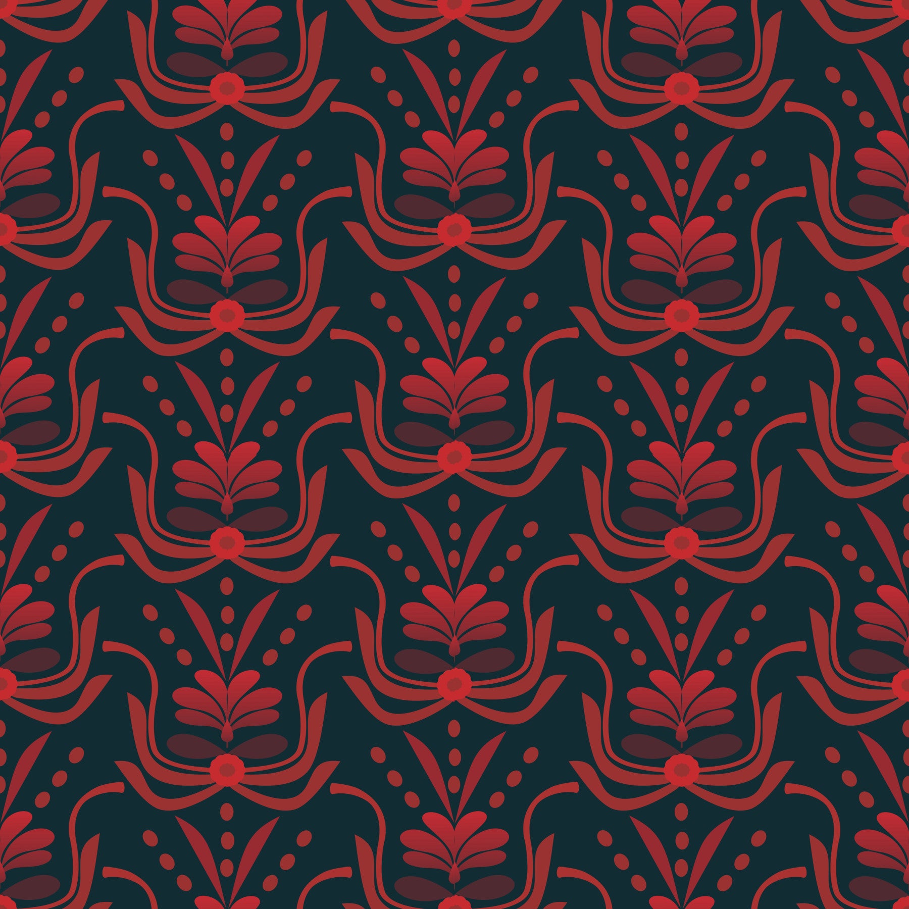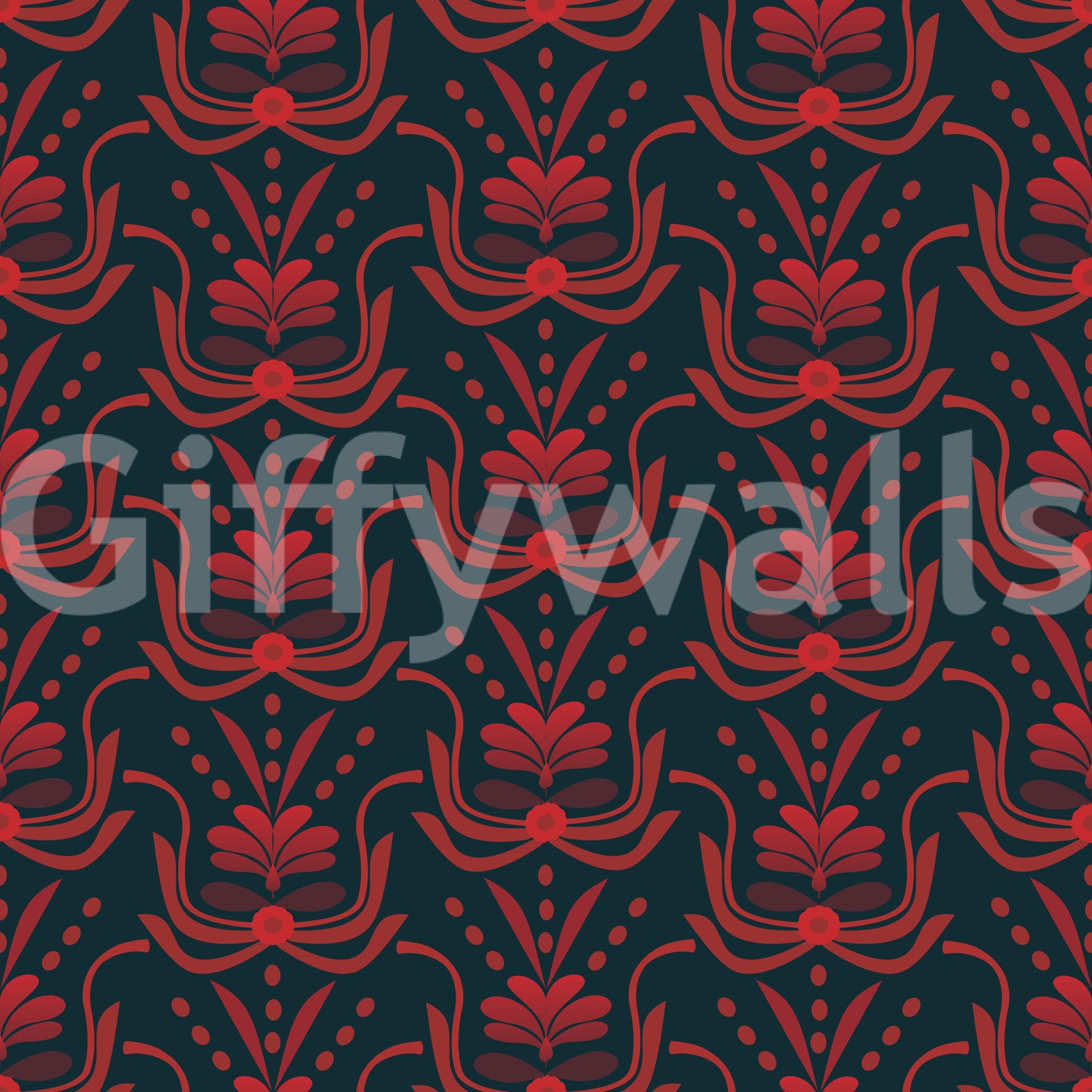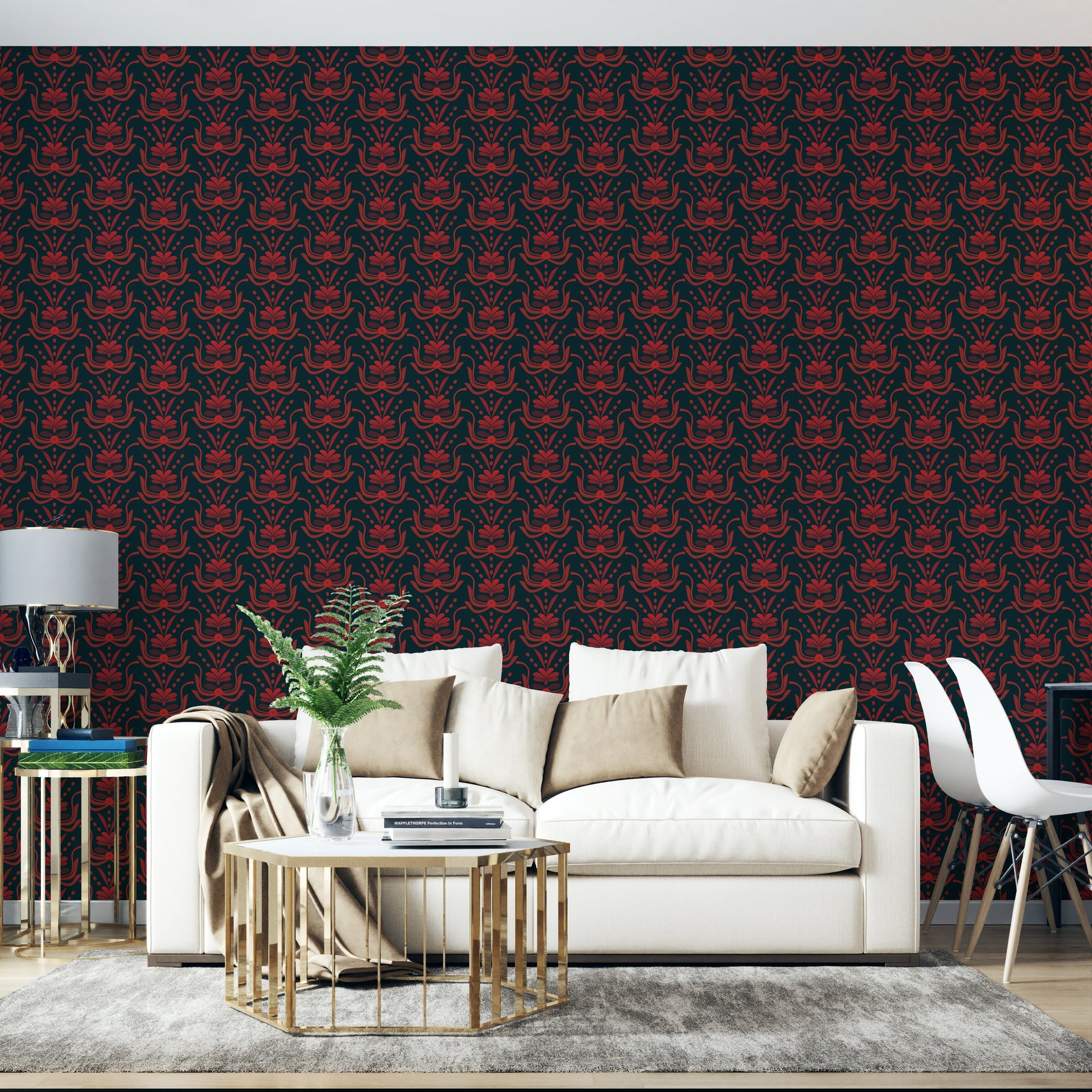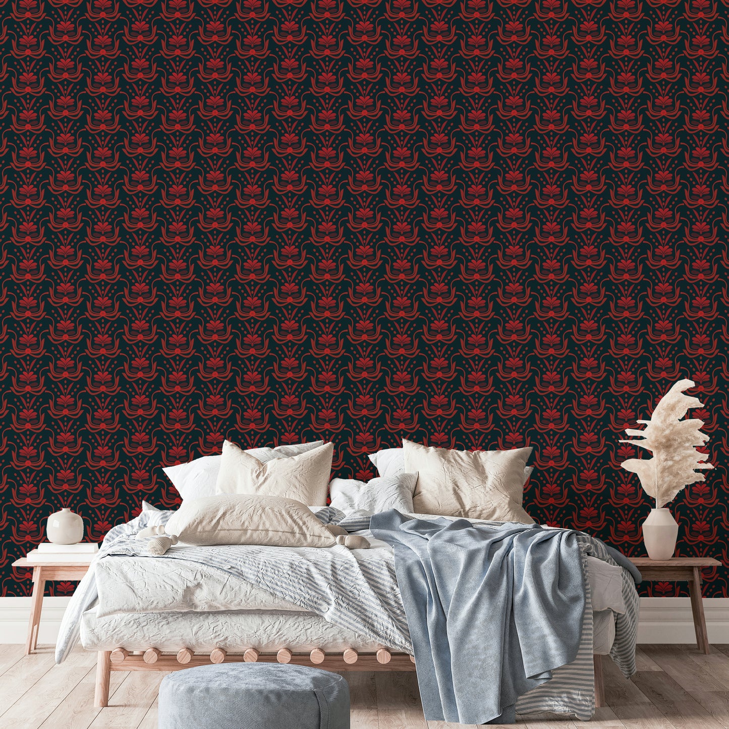 This wallpaper presents a striking stylized botanical damask pattern in a captivating palette of deep teal and vibrant crimson. The design features bold, graphic elements with a modern take on classic damask aesthetics. The repeating floral motifs create a sense of elegance and sophistication, suitable for a variety of interior design styles. The rich color contrast makes a bold statement while maintaining a sense of balance. This wallpaper will add a touch of drama and visual interest to any room, enhancing its overall style and ambiance. Perfect for those who appreciate unique and stylish home decor.