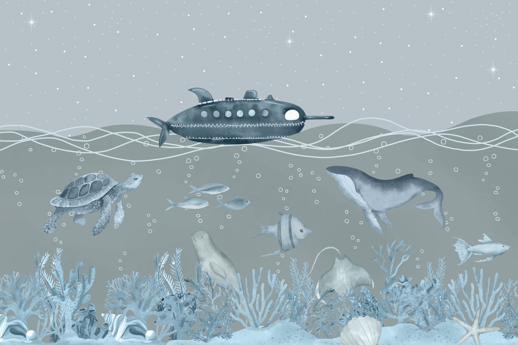 Explore the depths with this captivating ocean-themed design. A vintage-style submarine navigates through blue-gray waters filled with gentle sea creatures. It includes a sea turtle, fish, whale, and ray, all depicted in soft hues. This wallpaper for walls adds a touch of whimsy to children's rooms, bathrooms, and playrooms. The soft, monochrome palette creates a soothing environment, perfect for nurseries or bedrooms. The nautical style complements coastal decor beautifully.