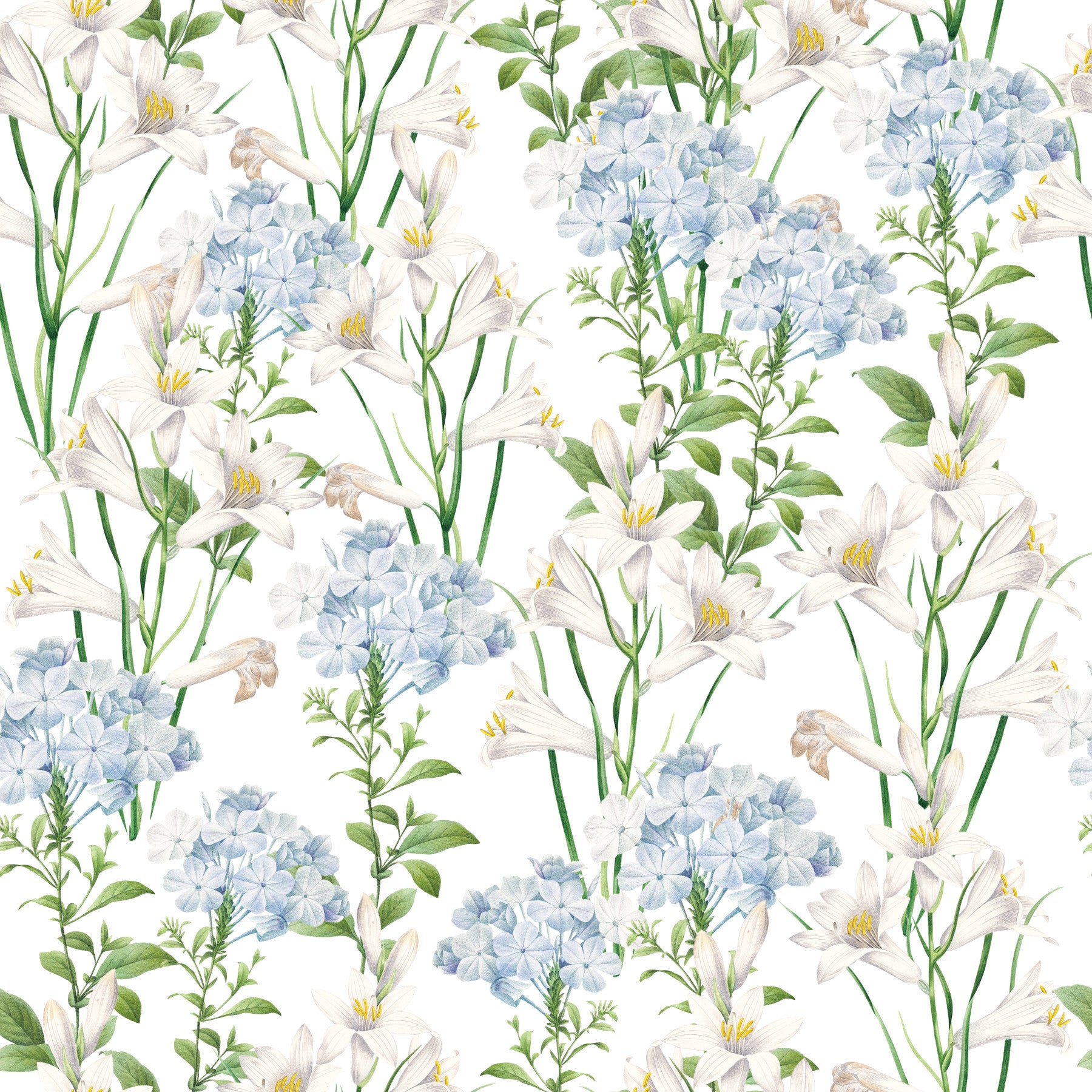Enhance your interior decor with this graceful wallpaper for walls. It displays a seamless pattern of white lilies and subtle blue blossoms. The gentle floral design introduces a sense of peace and elegance to any room. Imagine it brightening up your living room, adding a touch of spring to your bedroom, or creating a serene bathroom. The subtle color palette and refined style complement diverse design schemes, bringing nature's charm to your space.