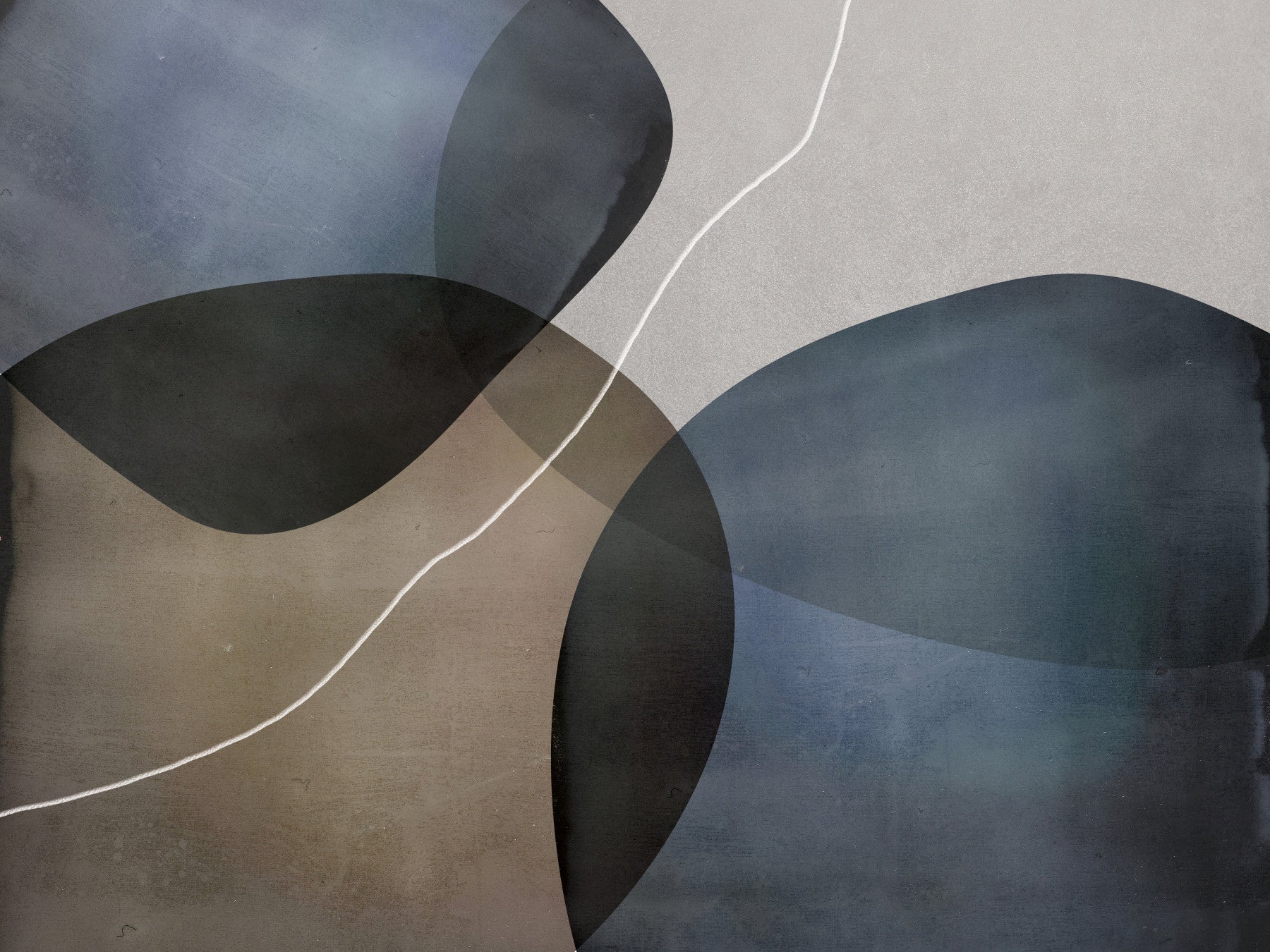 This abstract wallpaper for walls brings a fresh, contemporary feel to interiors. The design is characterised by its overlapping organic forms in neutral shades. Notice its gentle colour palette of cool blues, browns, and greys, enhanced with a white line. Suited for a home office, living room, or minimalist bedroom. The sophisticated, neutral colours allow you to create a soothing ambiance.