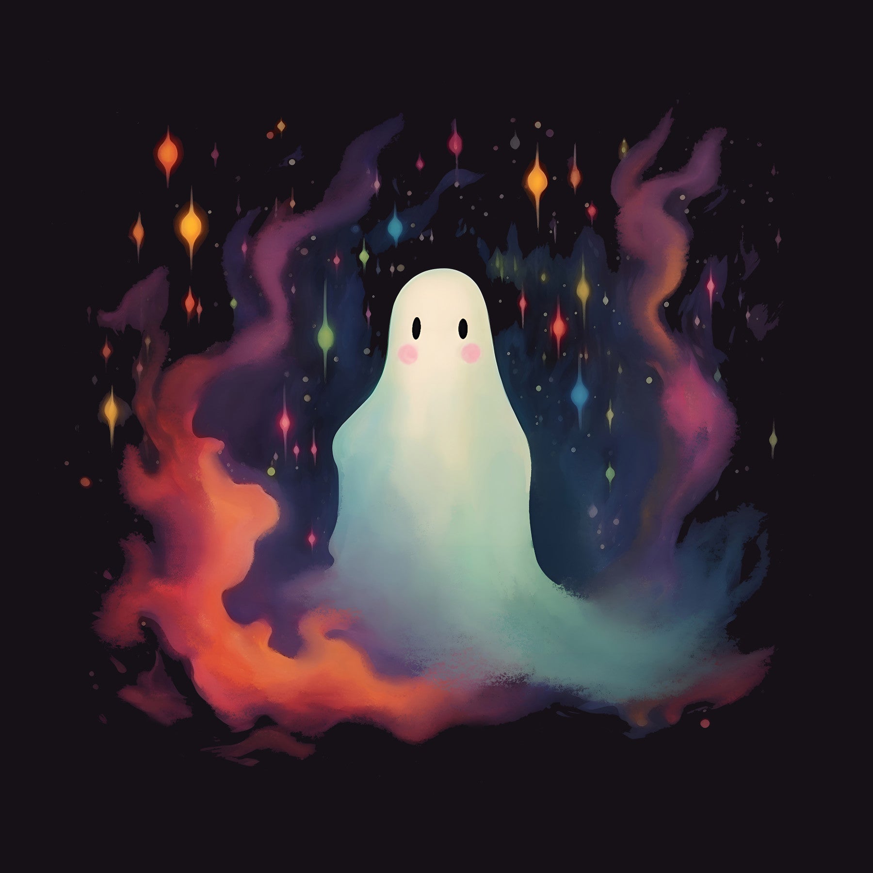 Embrace the enchanting paradox of 'Summer Night Ghost', a captivating wallpaper that blends spooky charm with whimsical delight. A friendly, ethereal ghost takes center stage, its pastel hues subtly illuminated against a deep, star-studded night sky. Swirls of vibrant, watercolor-esque smoke in fiery oranges and mystical purples dance around the spectral figure, adding a touch of playful drama. Dotted throughout the scene are glittering, jewel-toned stars, casting a magical ambiance that transforms your screen into a portal of delightful spectrality. This unique design offers a perfect balance of dark and light, creating a visually stimulating and subtly spooky experience. Perfect for those who appreciate the unexpected, 'Summer Night Ghost' brings a touch of otherworldly wonder to your digital space, reminding you to find the magic even in the shadows.
