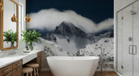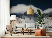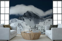 Enhance any space with this evocative mountain scene. Crisp white snow defines the rugged terrain, highlighted against a dark blue sky and dynamic cloud cover. The stark contrast and bold composition offer a dramatic touch. This wallpaper for walls functions wonderfully in a contemporary office or a minimalist living area. Its presence encourages focus and adds an artistic edge to any interior, creating an impactful feature wall.