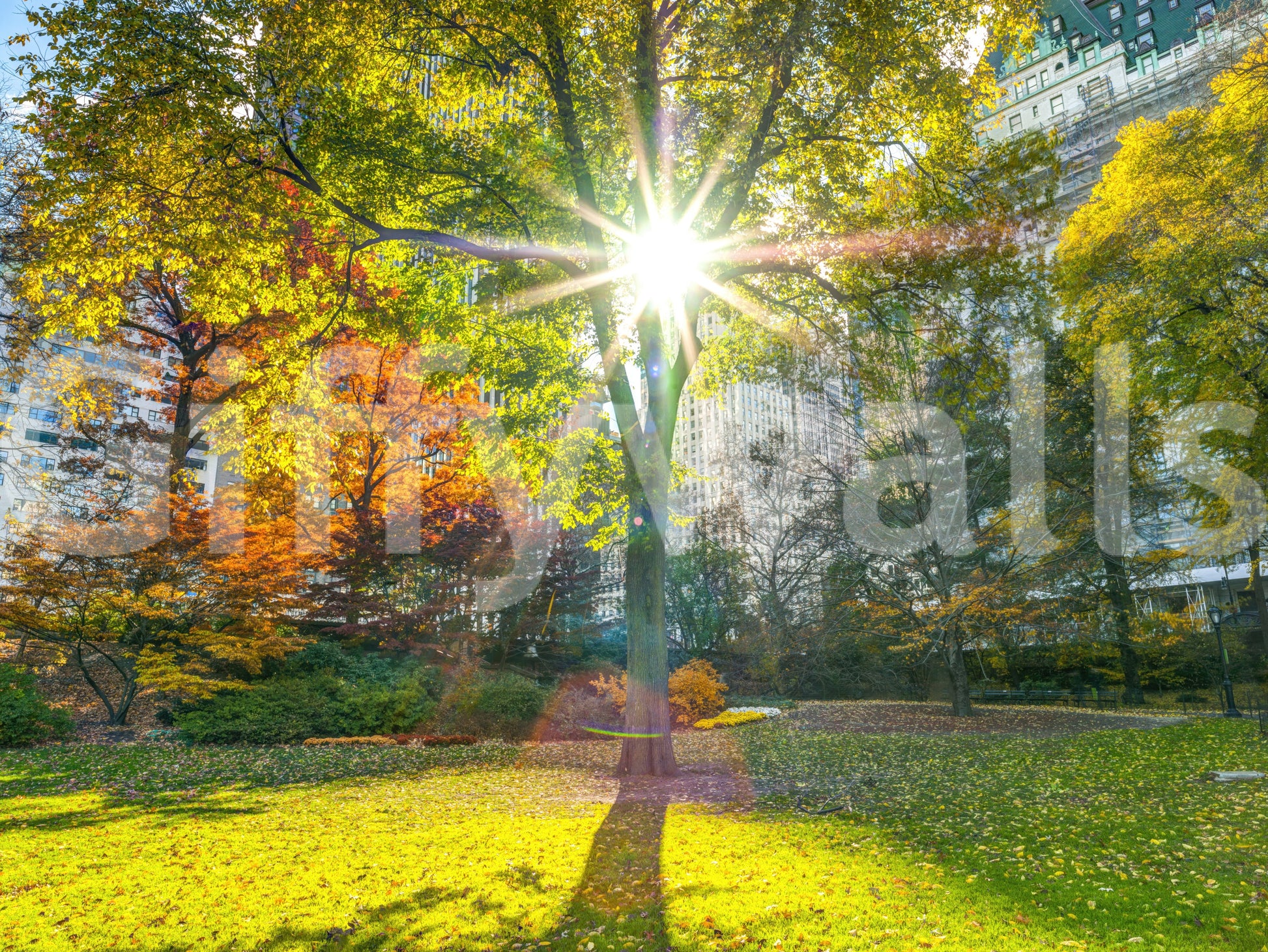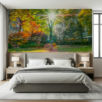 Sun rays through trees in park, Manhattan, New York. Immerse yourself in the vibrant heart of an urban oasis, where the energy of the city harmonises with the serenity of nature. This wall décor captures the golden embrace of autumn, with leaves ablaze in fiery oranges and sun-kissed yellows. A majestic tree stands as a beacon of light, its branches reaching towards the heavens, filtering the sun into a dazzling display. Glimpses of the city's architecture peek through the foliage, a reminder of the dynamic life that surrounds this tranquil haven. Infuse your living space with the warmth and vitality of this unique vista, bringing the invigorating spirit of autumn into your everyday world. Evoking feelings of peace and harmony, this scene transforms any room into a sanctuary of natural beauty amidst the urban landscape.