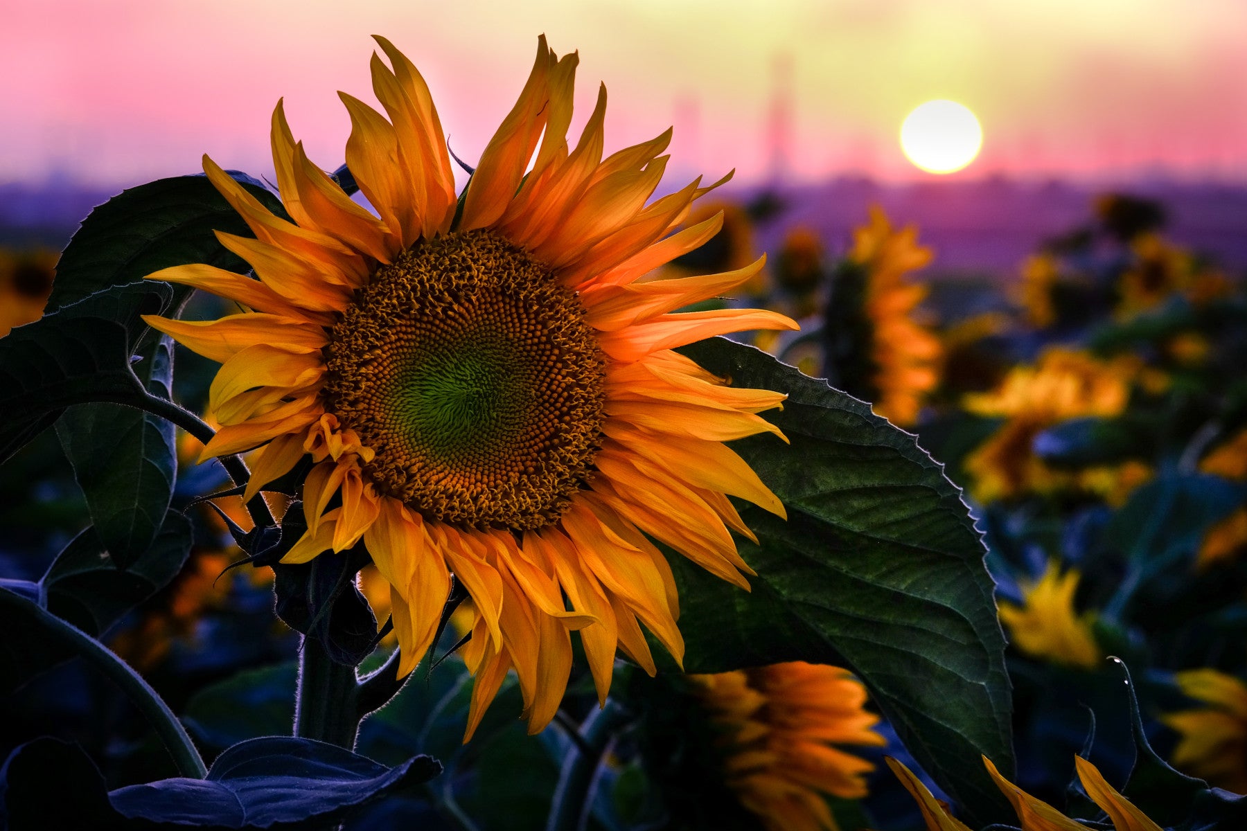 Bring the warmth of a summer sunset into your home with this stunning sunflower wallpaper for walls. The vibrant golden petals against the soft, pastel sky create a beautiful focal point. This design features a large sunflower in focus, surrounded by a field of sunflowers in the background. The colours blend seamlessly, making it ideal for a living room, bedroom, or dining area. Transform your interiors with this peaceful, nature-inspired scene.