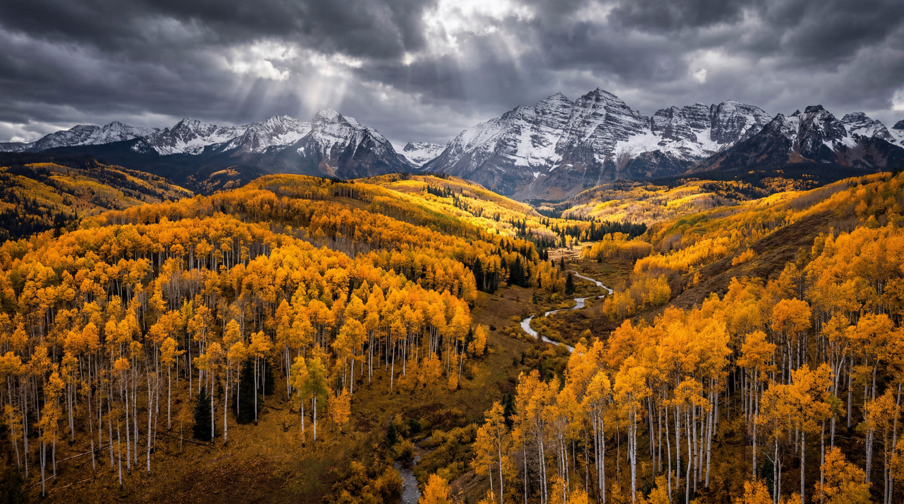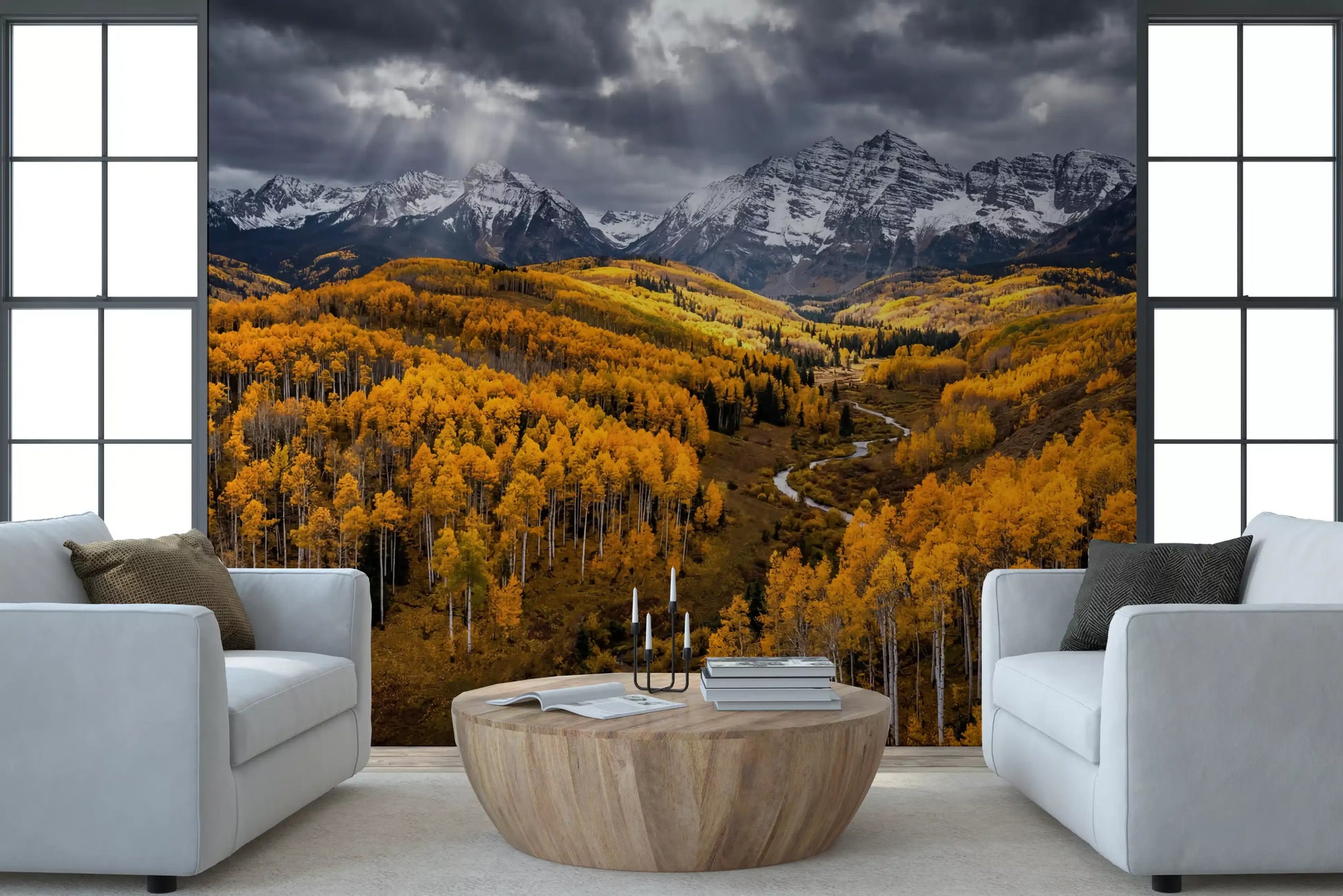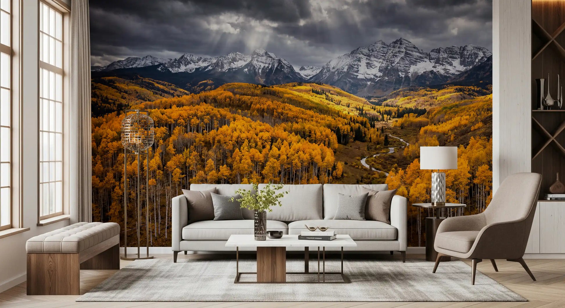 This stunning wallpaper for walls transforms any room into a majestic autumnal landscape. Vibrant golden aspen trees dominate the foreground and middle ground, creating a warm, inviting spectacle. Snow-capped mountains rise dramatically under a brooding, cloudy sky, where striking sun rays pierce through, illuminating parts of the golden valley. A winding river flows gracefully through the forest, adding a serene element to the grand vista. The rich colour palette features striking golds, deep greys, crisp whites, and subtle dark greens, offering a luxurious yet earthy feel. Ideal for a living room, dining room, or a serene home office, this design complements rustic, modern, or traditional interiors by adding depth and a powerful connection to nature.