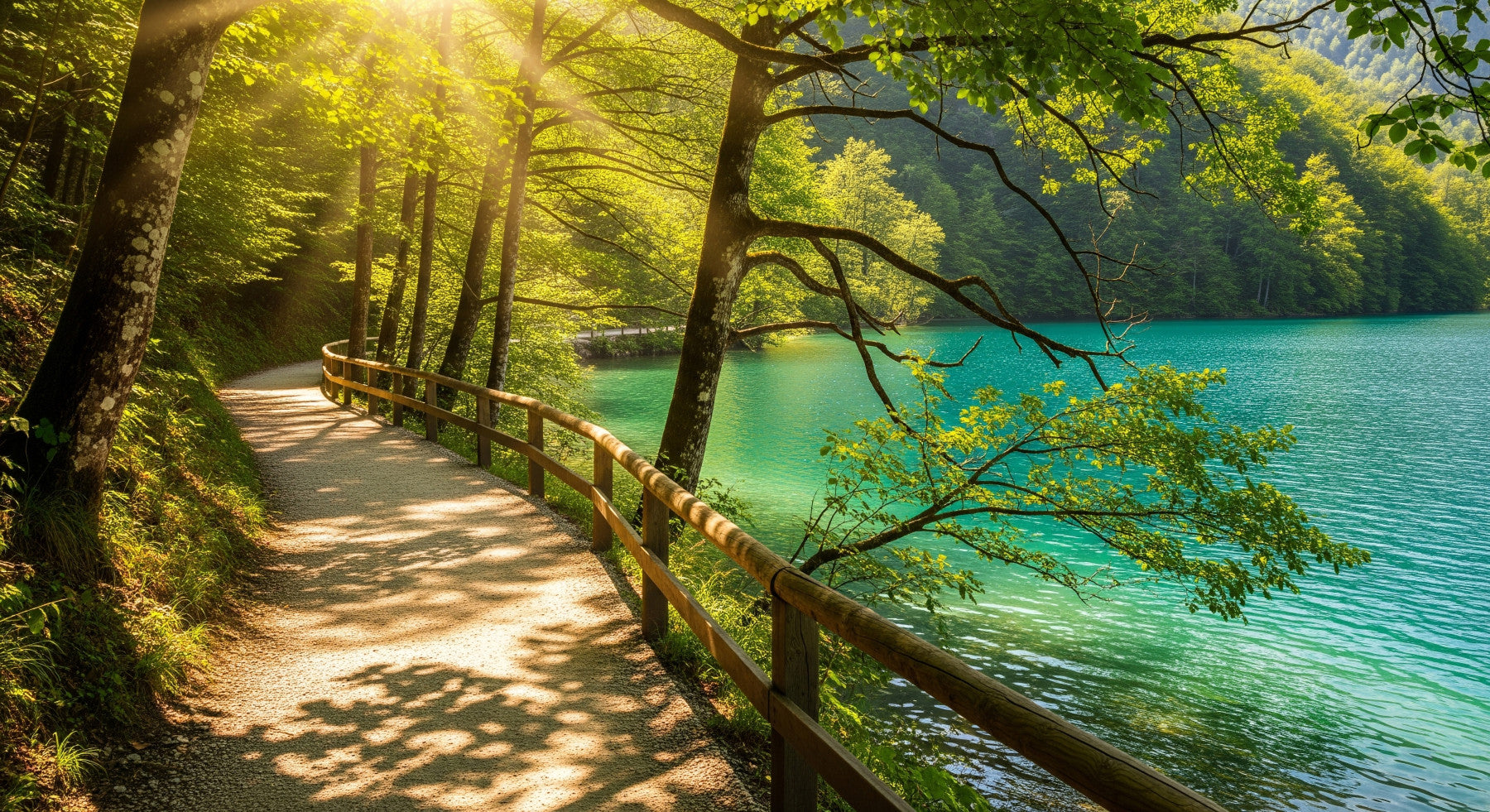 Elevate your home's aesthetic with this stunning wallpaper for walls. The design showcases a sun-drenched path running parallel to a tranquil lake. Lush trees cast gentle shadows along the pathway, adding depth and intrigue. The turquoise water provides a striking visual contrast, creating a serene and inviting ambience. This wallpaper's natural beauty makes it a perfect fit for living rooms, hallways, or bedrooms. The design will enhance your space with the beauty of the outdoors. Infuse any room with a sense of peace and natural charm.