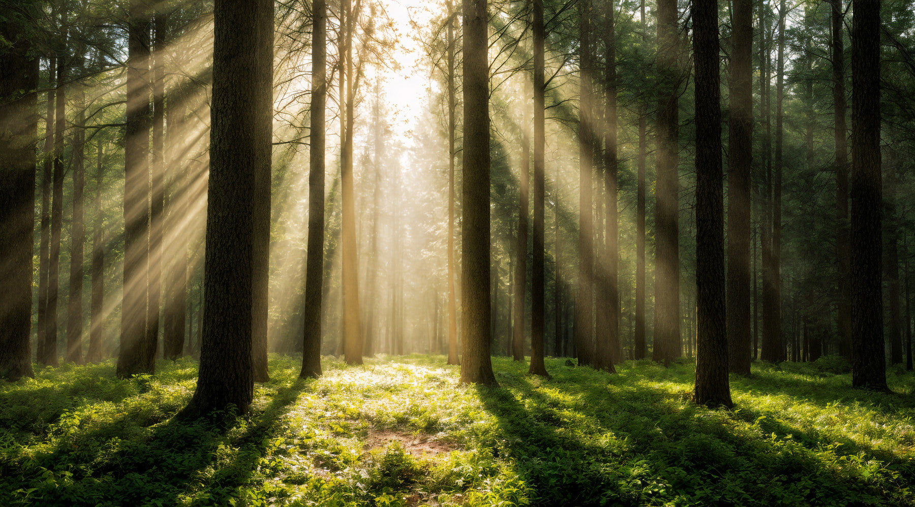Transform your space with this enchanting forest scene. Sunlight streams through tall trees, illuminating the verdant ground below. The interplay of light and shadow creates a tranquil and inviting atmosphere. This wallpaper for walls brings a touch of nature indoors, perfect for bedrooms, living rooms, or any space seeking a calming, organic ambiance. The design is simple and blends with a minimalist or rustic interior, infusing your home with serenity.