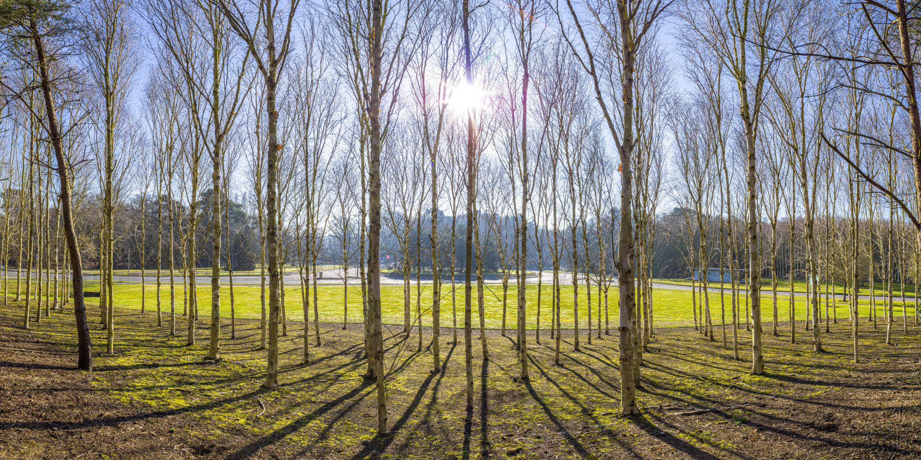 Autumn forest. Bring a touch of natural serenity inside with this detailed woodland scene. Tall, slender trees stand in neat rows, casting long shadows across a bright green meadow. The sunlight filtering through creates a calming, open ambience. This wallpaper for walls transforms your space with a refreshing outdoor feel. It is perfectly suited for living rooms, bedrooms, or home offices, where the clean lines and natural tones will complement both modern and rustic interiors, bringing harmony and light to any room.