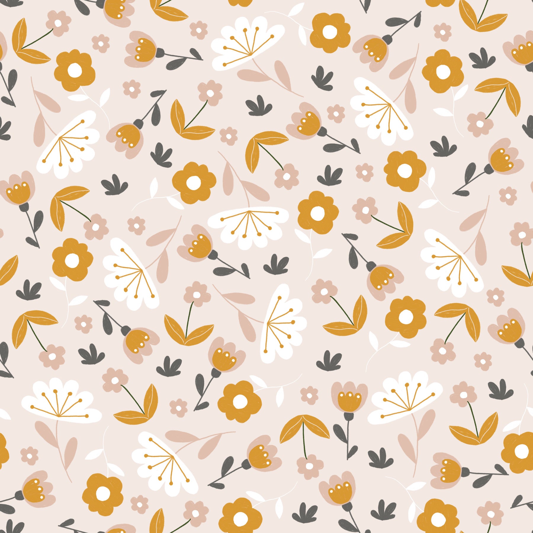 Brighten rooms with this fresh floral wallpaper for walls. Mustard blooms dance alongside simple white and blush florals. Charcoal foliage adds a modern contrast. The soft beige backdrop provides a gentle feel. The entire design boasts a handmade, whimsical charm. Install this in a nursery, bedroom, or bathroom to create an uplifting space. Consider it in modern, Scandinavian, or even boho settings. The pattern adds beauty to interiors without overwhelming them.