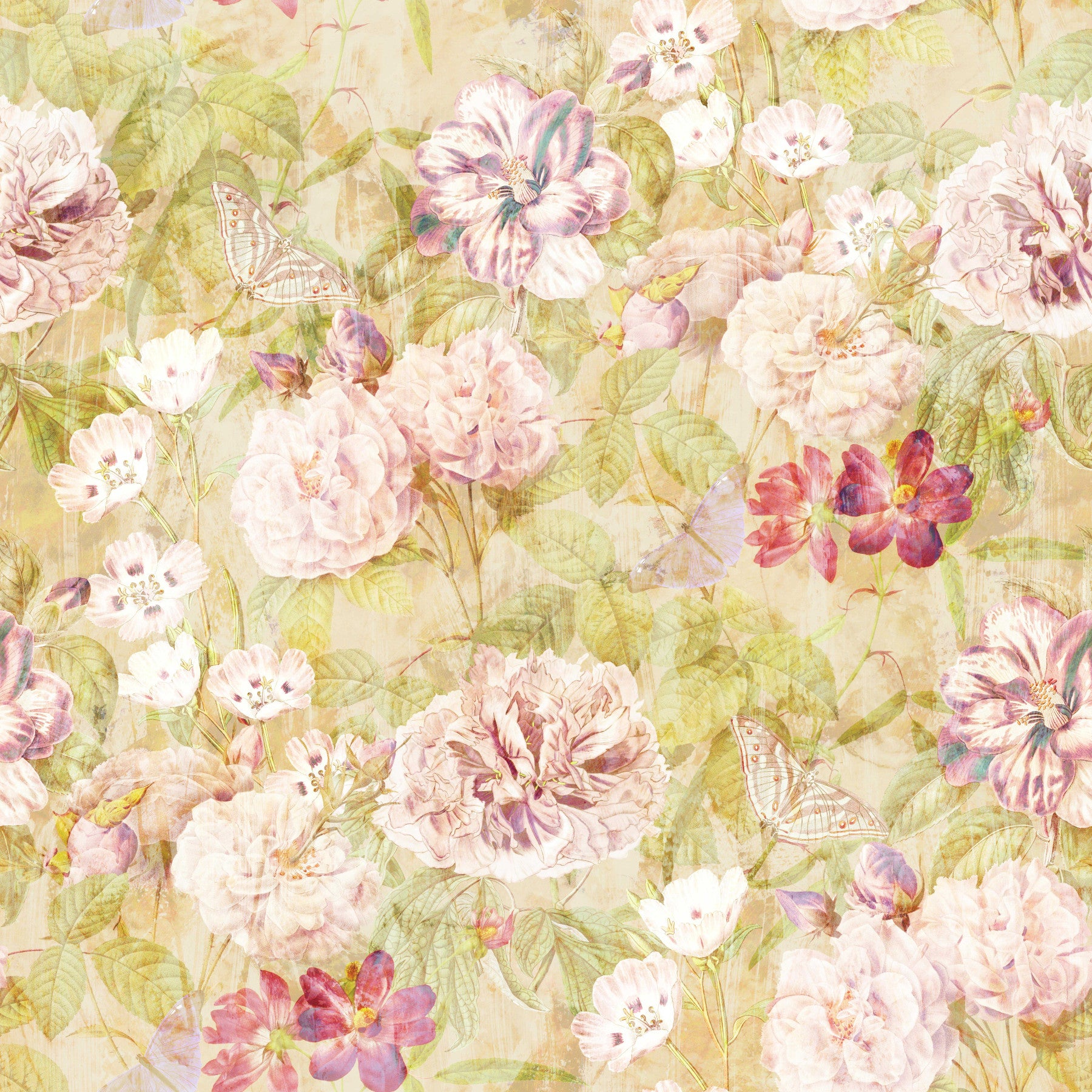 Immerse yourself in the gentle grace of vintage florals. This wallpaper for walls features delicate pink blooms and fluttering butterflies on a soft beige backdrop. The pattern evokes a classic, romantic feel. The faded effect lends an antique touch that would elevate bedrooms, living rooms, or dining areas. Let this design infuse warmth and character into interiors, creating a tranquil and inviting space with its botanical charm.