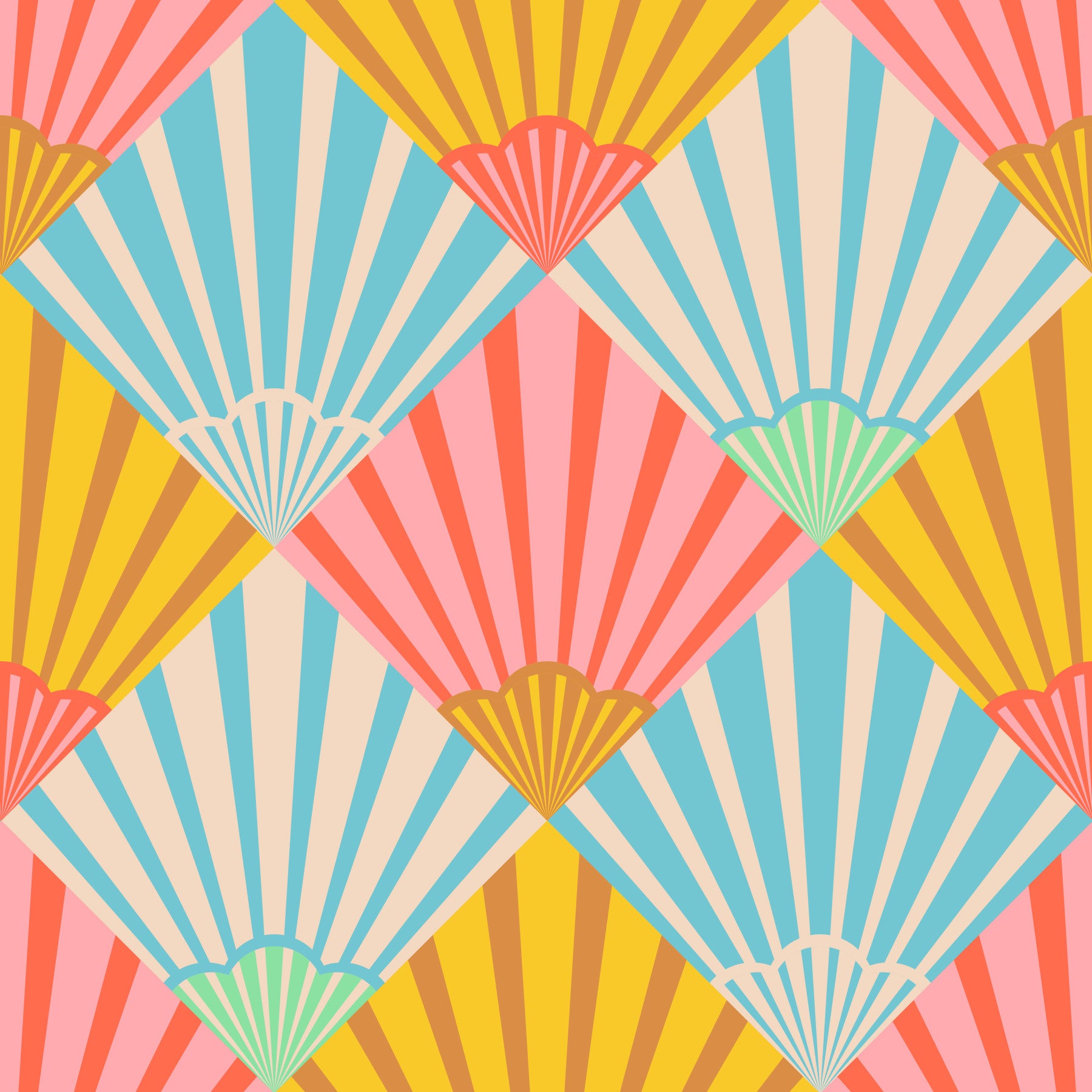 Evoke a retro-chic ambiance with this captivating Sunrise wallpaper that vibrantly fuses vintage geometric Art Deco style with a Mid Century Modern multicolored pastel colour palette. This abstract pattern of radiating sunrise motifs in a structured diamond layout is visually dynamic and captivating. The color palette is a delightful blend of soft pastels, including red and pale pink, sunny yellow and brown, and serene blue and cream with mint green, which come together to create an uplifting and airy atmosphere. Perfect for adding a touch of sophisticated nostalgia and playful energy to any space, this wallpaper is sure to transform your walls into a stunning statement piece. Embrace the beauty of bygone eras with a contemporary twist. This pattern design is also available in Other Colourways too! Original wallpaper pattern design by Jackie Tahara of UnBlink Studio.