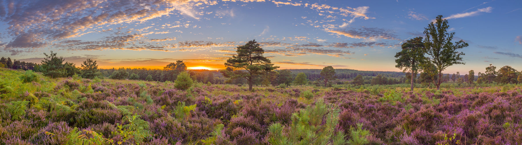 Beautiful landscape in countryside. Transform your space with the magic of a heather-filled landscape at sunrise. See the beauty of nature with blooming heather in purple tones, with trees silhouetted against a colourful sky. The rising sun adds a golden touch. Consider this wallpaper for walls to create a relaxing backdrop in any room. It blends seamlessly with various design styles, from modern to rustic, bringing the calming essence of the outdoors inside.