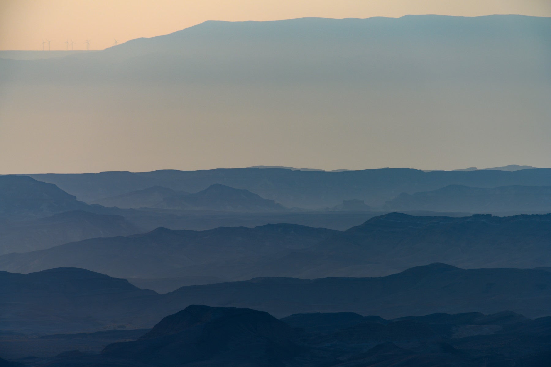 Witness the majestic beauty of Sunrise over Ramon Crater #6 a breathtaking wallpaper capturing the ethereal dawn light washing over the rugged landscape. This image showcases the unique geological formations of the Ramon Crater, also known as Makhtesh Ramon, with its layered hills and valleys rendered in captivating shades of blue and grey. The distant horizon, softly illuminated by the nascent sun, hints at the vastness of the Negev desert. Subtle atmospheric perspective creates a sense of depth and tranquility, inviting contemplation. The faint silhouettes of distant windmills on the horizon subtly blend the natural and modern worlds. Transform your screen into a window to this serene desert vista, bringing a touch of calm and wonder to your everyday digital experience.