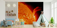 Experience the sun's fiery temper with this arresting wallpaper. Intense reds and oranges explode across the canvas, offset by the inky black of space. This bold choice makes a strong impression and would work well as wallpaper for walls in a home office or modern loft. The design enhances interiors with its dramatic flair, injecting energy and character. Let the fiery colours inspire you. It suits minimalist interiors too, providing a focal point.