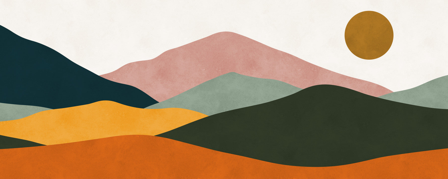 Invite the peace of nature indoors with this wallpaper, depicting stylized mountain layers at sunset. Bold curves in terracotta, gold, sage, teal and blush evoke a serene landscape. Consider this wallpaper for walls to amplify the beauty of your living space. Perfect for living rooms, home offices, or bedrooms, this design integrates with boho chic or mid-century modern styles. The muted tones create a relaxing atmosphere, while the geometric shapes lend a contemporary edge.