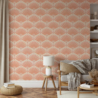 Bathe your walls in the warm glow of 'Sunset Palm Paradise'. This wallpaper features a stylized depiction of palm leaves in sunset hues of peach, coral, and cream. The design is a seamless pattern, perfect for creating a tranquil and calming atmosphere in any room. The subtle texture and soft color palette create a sense of serene sophistication. Whether in a bedroom, living room, or even a hallway, this wallpaper will transform your space into a peaceful oasis. The artistic, hand-drawn quality adds a touch of unique charm, making it a stunning focal point for your home decor.