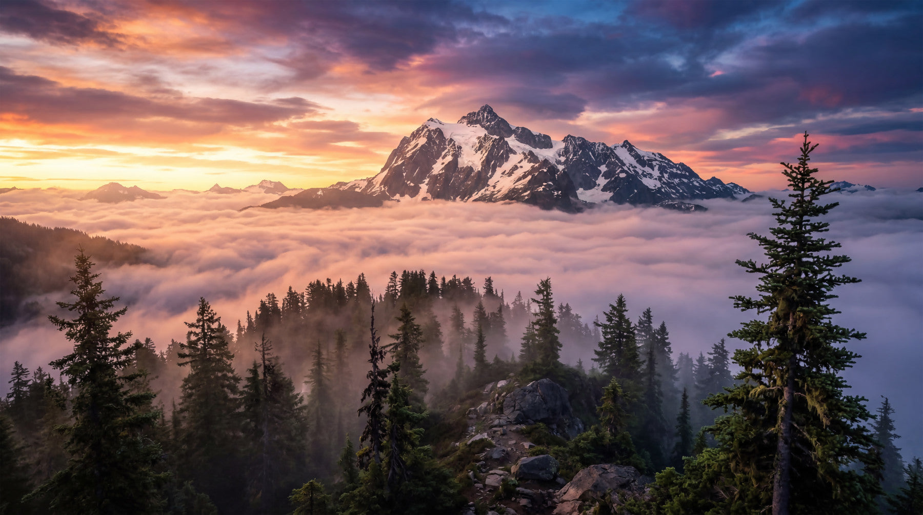 Transform your living space with this breathtaking mountain landscape wallpaper for walls. It captures a majestic snow-capped peak rising above a soft sea of clouds, framed by towering pine trees. The dramatic sky showcases a vibrant palette of warm oranges and soft pinks blending into deep purples and blues. This design brings the awe-inspiring beauty of nature directly into your home. It creates an expansive vista, perfect for establishing a serene focal point in a living room, bedroom, or home office. The ethereal glow and grand scale evoke a sense of peace and wonder, turning any wall into a window to a tranquil, elevated world.