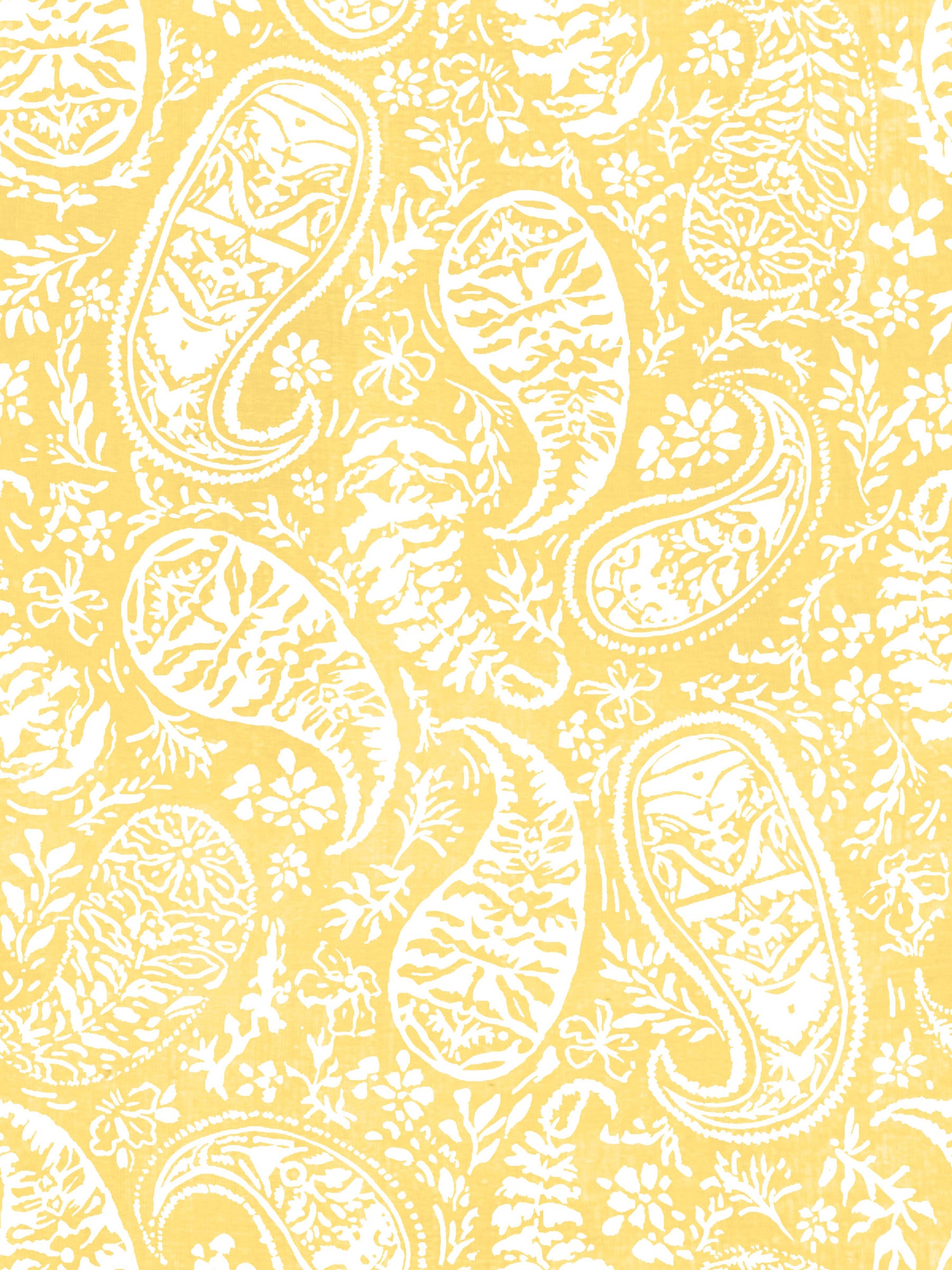 Invite sunshine into your space with this bright, floral-inspired paisley pattern. The joyful yellow base presents a lively backdrop. Elegant white paisley and floral elements dance across the surface, creating a design that feels both fresh and timeless. Use this wallpaper for walls to bring warmth and personality to your bedroom, living room, or even a hallway. Its cheerful design is also suitable for a powder room.