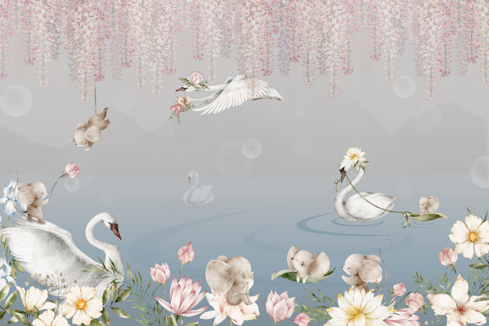 Swan Lake & Baby Elephant Nursery Wallpaper