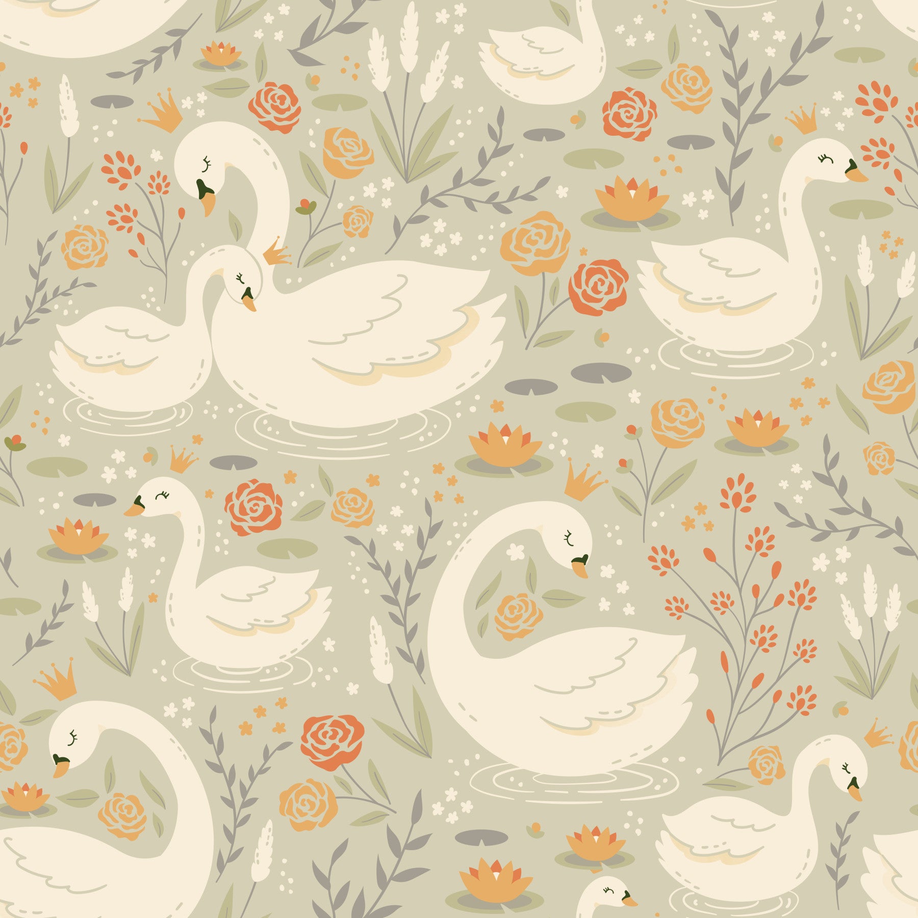 Float into a world of peaceful elegance with this charming wallpaper. Graceful swans glide amongst soft orange roses and water lilies on a muted background. The design uses a palette of beige, light orange, and soft green to create a calm mood. This wallpaper for walls introduces a whimsical yet sophisticated touch. It's perfect for nurseries, bedrooms, or any space where you want to invite calm and serenity. The muted tones make it easy to pair with many decor styles, from modern to traditional.