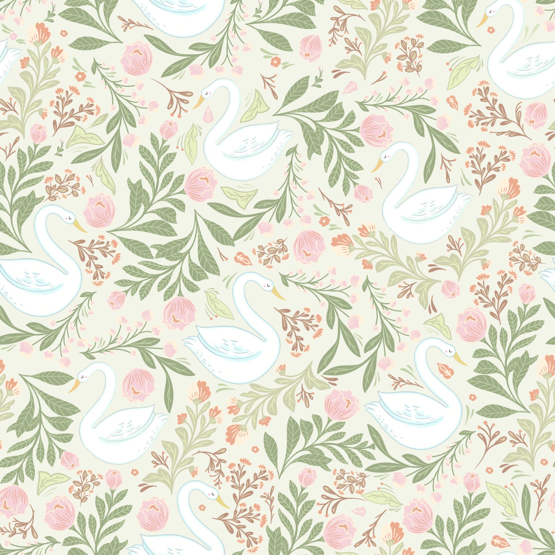 This elegant wallpaper for walls showcases gentle swans nestled among delicate floral patterns. Soft pinks and muted greens create a peaceful atmosphere. The charming design adds a touch of classic grace to nurseries, bedrooms, or reading nooks. The subtle color palette ensures this wallpaper complements a range of interior styles, from modern farmhouse to traditional décor. Let this timeless design create a serene and sophisticated space.