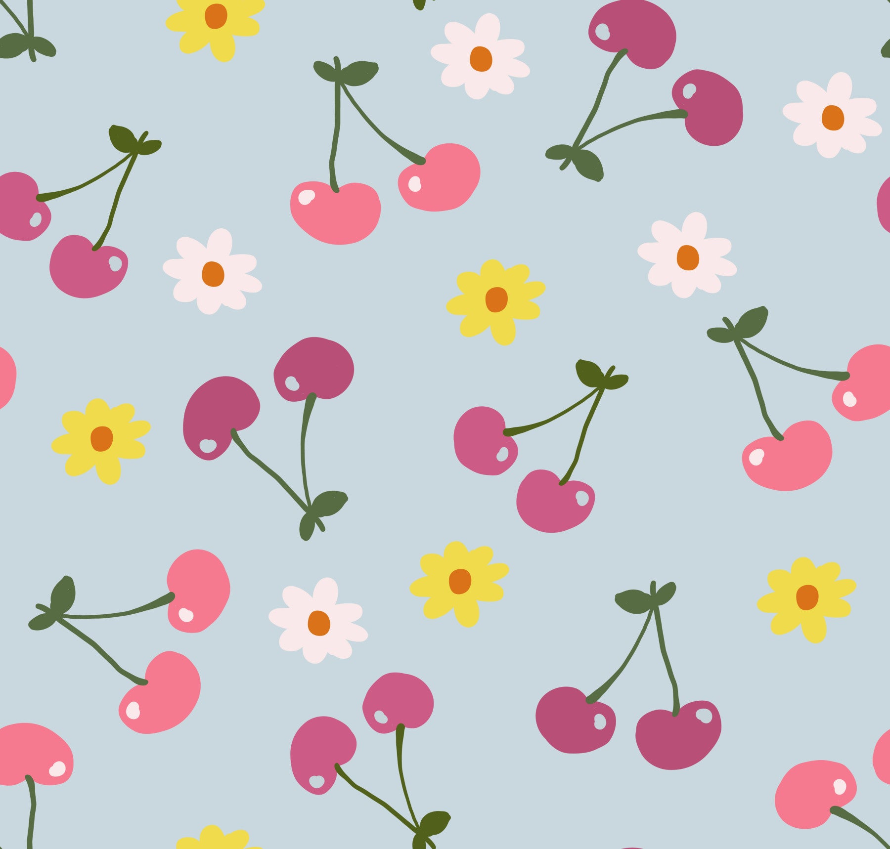 Bring a touch of playful charm into your home with this delightful cherry and flower wallpaper. This cheerful design features hand-drawn cherries and daisies scattered across a soft blue backdrop. The simple, bold shapes create a fresh and vibrant look. This wallpaper for walls brightens any space. Ideal for a kitchen, nursery, or children's room, it adds a light and airy feel that will cheer up your interiors. Transform your living space with this fun and stylish design!