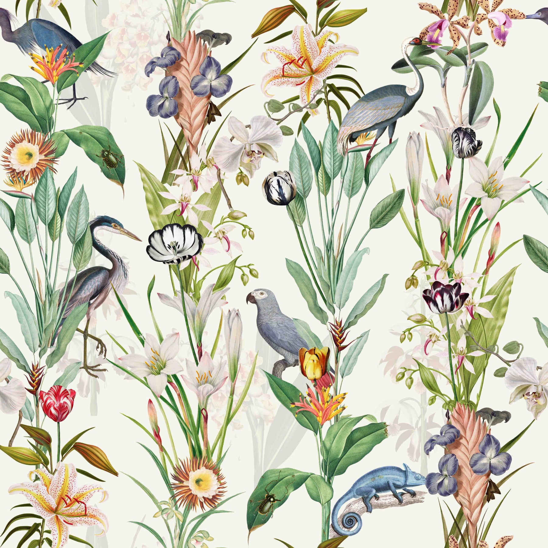 Drift into a 'Sweet Dream' with this enchanting wallpaper, where vintage botanical illustrations meet whimsical wildlife. Delicate orchids and vibrant lilies intertwine, framing elegant herons, a curious parrot, and a stealthy chameleon. The soft, muted color palette evokes a sense of serenity and calm, as if wandering through a lush, exotic garden in a half-remembered dream. Let the intricate details of this design transport you to a peaceful oasis, making it the perfect backdrop for a restful and inspiring atmosphere.